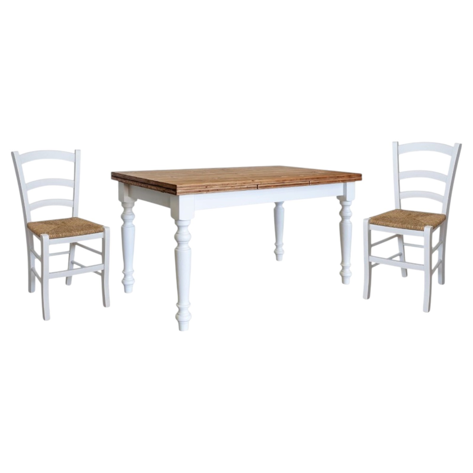 Set tavolo shabby gamba tornita 100x70 120x80 130x85 140x80 160x85 allungabile con 4/6 sedie seduta paglia VISTA FRONTALE