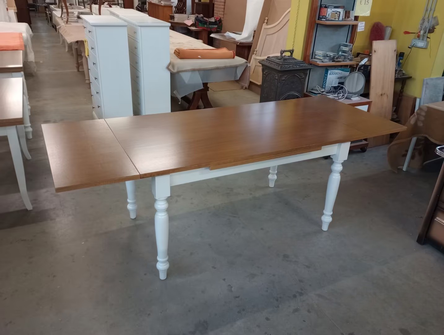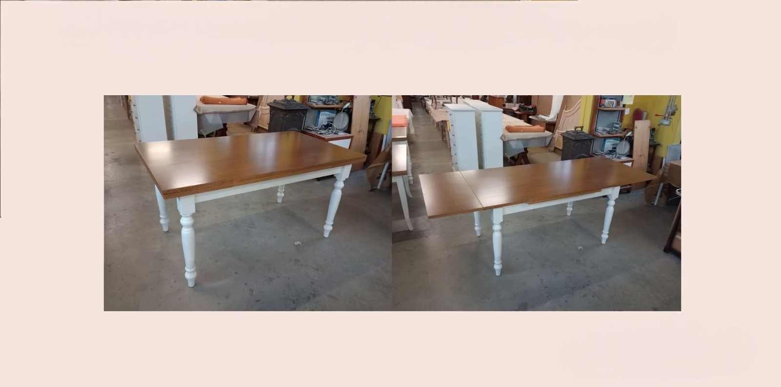 Tavolo shabby costruito in legno massello di pioppo rendendo il mobile solido e robusto. Piano rettangolare con gambe tornite, dotato di due allunghe laterali allungabile con apertura laterale da entrambe i lati, detta anche ' apertura a tiro '. Le allunghe sono riposte sotto il piano pronte all' occorrenza per ospitare numerose persone. Ideale per la zona giorno o per la zona della taverna ospitando amici per il pranzo o per la cena.