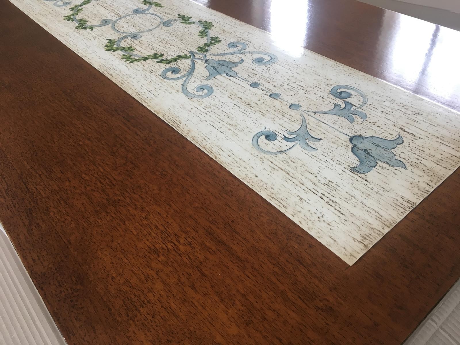 Tavolo in arte povera elegante e con proporzioni perfette per qualsiasi stanza accompagnato da 4/6 sedie imbottite. Piano rettangolare con dipinto realizzato a mano, dotato di 2 allunghe da 40 cm, con apertura laterale da entrambe i lati, detta anche apertura a " tiro " le allunghe sono riposte sotto il piano. Elemento d' arredo adatto per salotti e nelle cucine, esteticamente appagante e allo stesso tempo funzionale e spazioso.