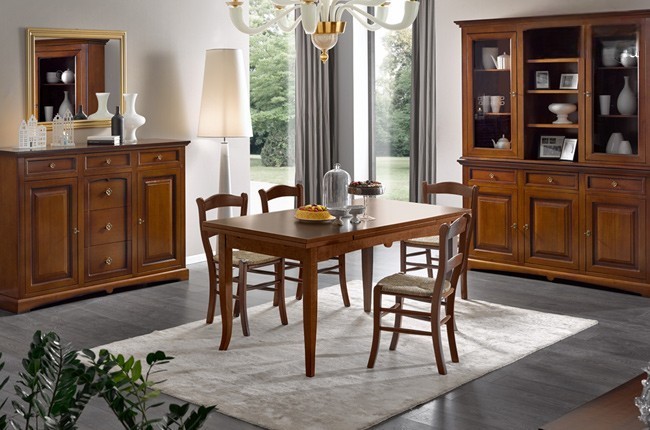 Tavolo costruito in legno massello di pioppo rendendo il mobile solido e robusto. Piano rettangolare con gambe a sciabola, dotato di due allunghe laterali da 40 cm allungabile con apertura laterale da entrambe i lati, detta anche ' apertura a tiro '. Le allunghe sono riposte sotto il piano pronte all' occorrenza per ospitare numerose persone. Ideale per la zona giorno o per la zona della taverna ospitando amici per il pranzo o per la cena.