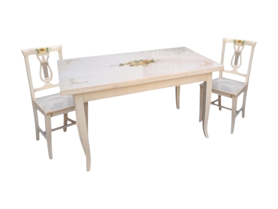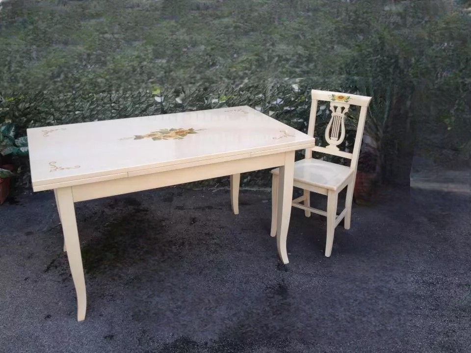 Tavolo in stile provenzale elegante e con proporzioni perfette per qualsiasi stanza accompagnato da 4/6 sedie seduta legno. Piano rettangolare con dipinto realizzato a mano, dotato di 2 allunghe, con apertura laterale da entrambe i lati, detta anche apertura a " tiro " le allunghe sono riposte sotto il piano. Elemento d' arredo adatto per salotti e nelle cucine, esteticamente appagante e allo stesso tempo funzionale e spazioso.