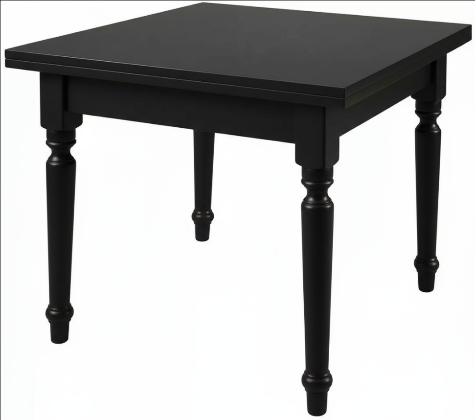 Tavolo costruito in legno massello di pioppo rendendo il mobile solido e allo stesso tempo elegante. Piano quadrato con gambe a sciabola. Dotato di un'apertura a libro con scorrimento per ospitare occasionalmente numerose persone per il pranzo o per la cena. Ideale per il soggiorno o in cucina.