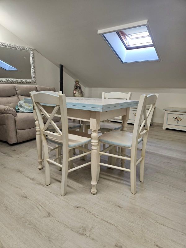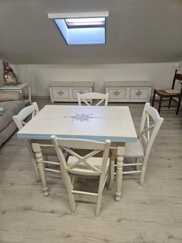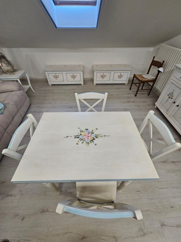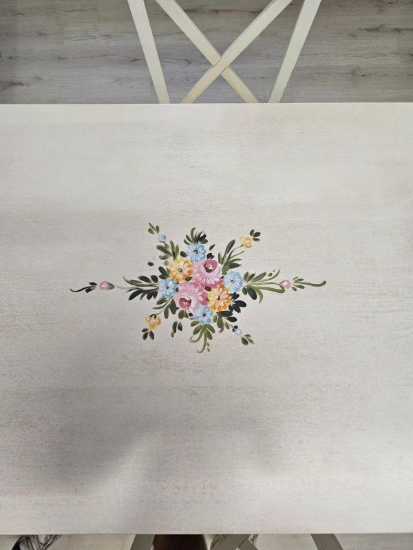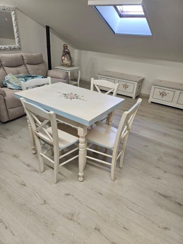 Set tavolo bianco anticato decorato 100x70 120x80 140x80 160x85 allungabile con 4/6 sedie seduta legno