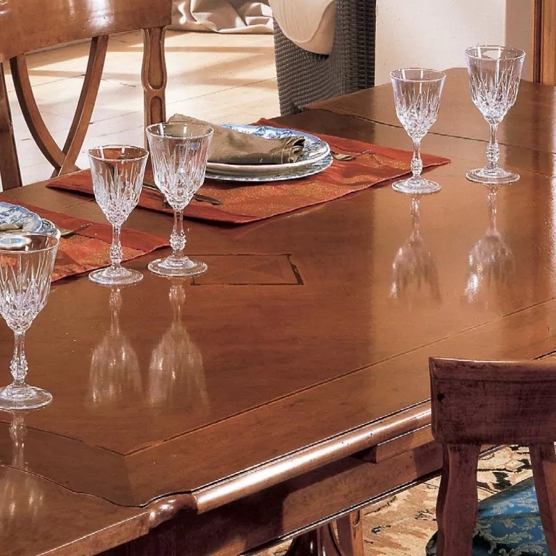 Tavolo costruito in legno massello rendendo il mobile solido e robusto. Piano rettangolare stondato con intarsio e con gambe tornite per ospitare numerose persone. Ideale per la zona giorno o per la zona della cucina ospitando amici per il pranzo o per la cena.