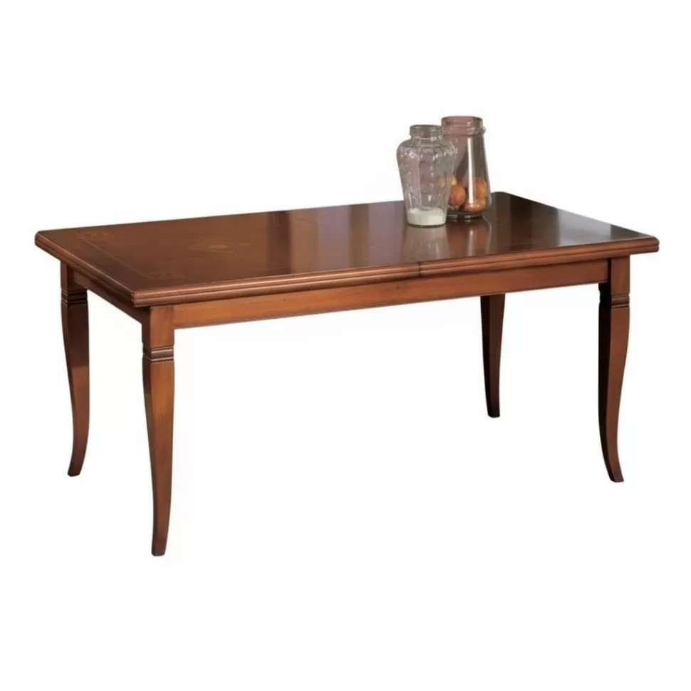 Tavolo costruito in legno massello rettangolare con gambe a sciabola intagliate rendendo il mobile solido e allo stesso tempo elegante. Dotato di 4 allunghe da 45 cm allungabile con apertura centrale, le allunghe sono riposte sotto il piano. Ideale per il soggiorno o in cucina.
