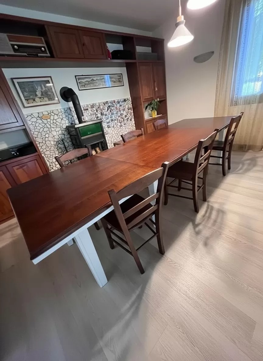 Tavolo costruito in legno massello di pioppo rendendo il mobile solido e allo stesso tempo elegante. Piano rettangolare con gambe sagomate sdoppiabili. Tavolo allungabile dotato di 4 allunghe da 45 cm con apertura centrale, le allunghe sono riposte sotto il piano. Ideale per il soggiorno o in taverna accompagnato da 6 comode sedie con seduta legno.