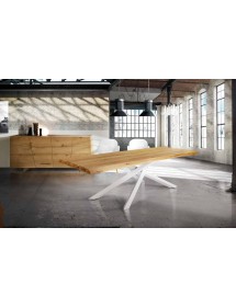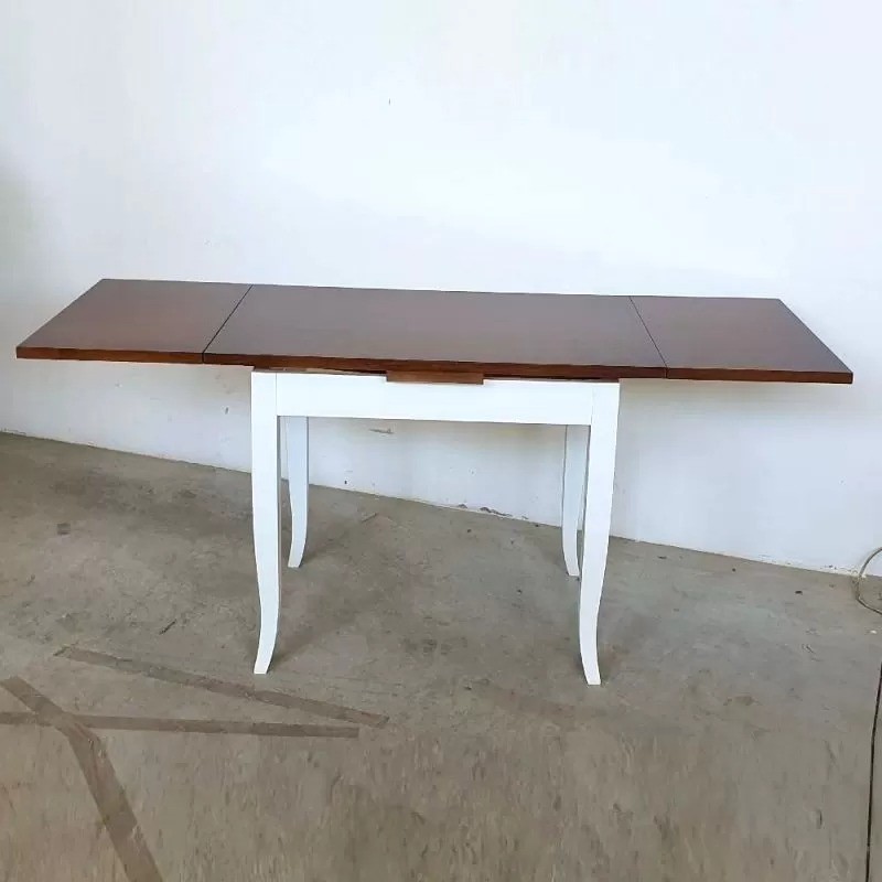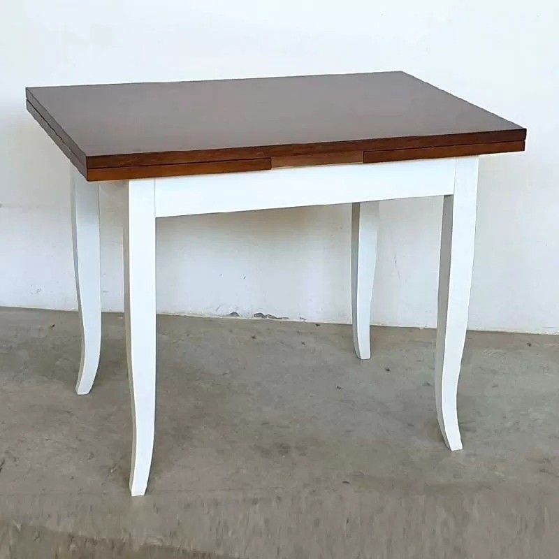 Tavolo costruito in legno massello di pioppo rendendo il mobile solido e robusto. Piano rettangolare con gambe a sciabola, dotato di due allunghe laterali da 40 cm allungabile con apertura laterale da entrambe i lati, detta anche ' apertura a tiro '. Le allunghe sono riposte sotto il piano pronte all' occorrenza per ospitare numerose persone. Ideale per la zona giorno o per la zona della taverna ospitando amici per il pranzo o per la cena.