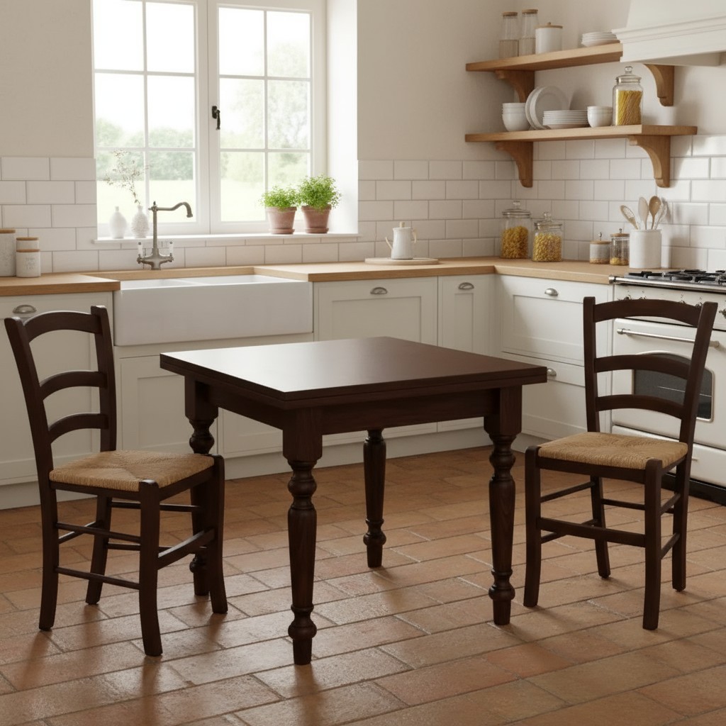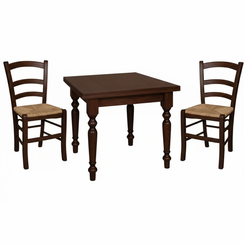 Set tavolo quadrato arte povera gamba tornita 90x90 100x100 allungabile con 4 sedie seduta paglia