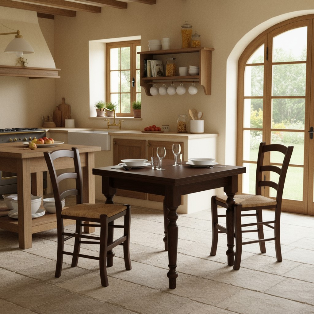 • Set tavolo quadrato arte povera gamba tornita 90x90 100x100 allungabile con 4 sedie seduta paglia