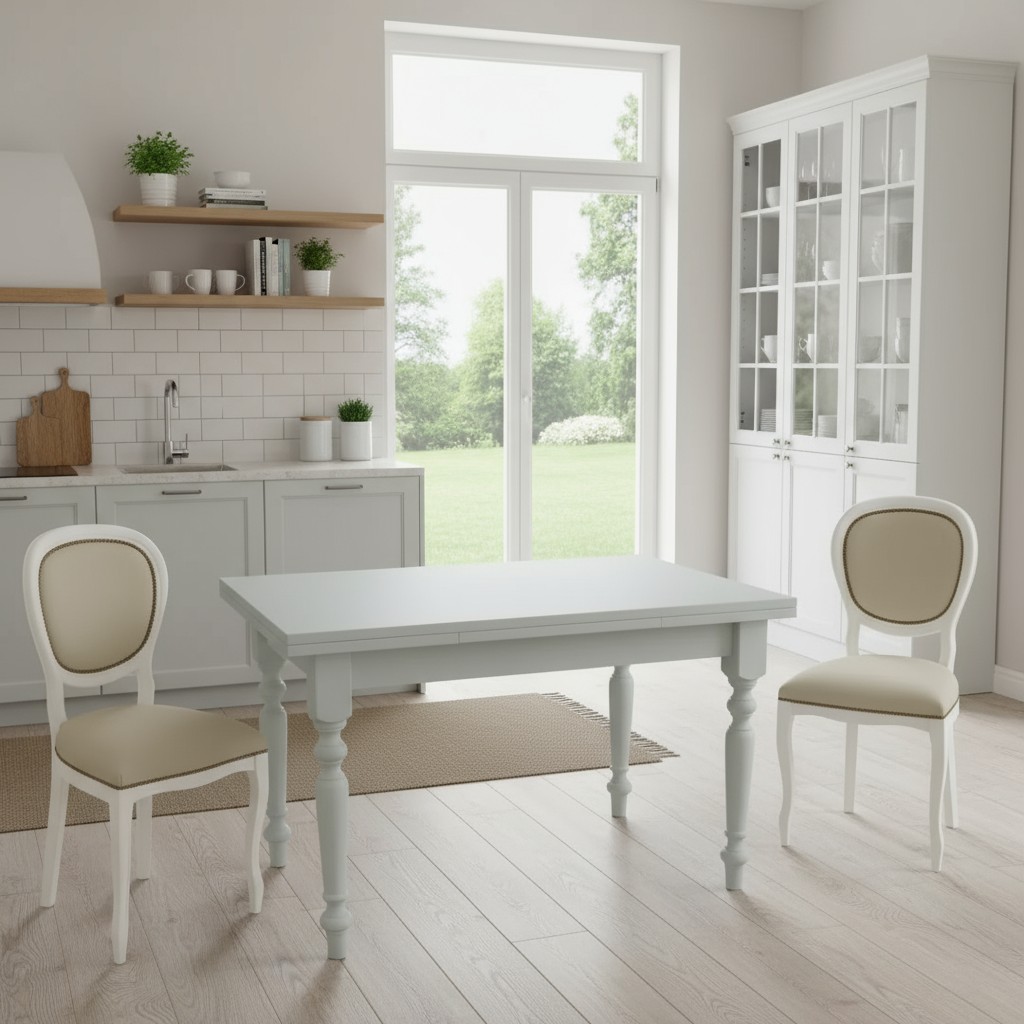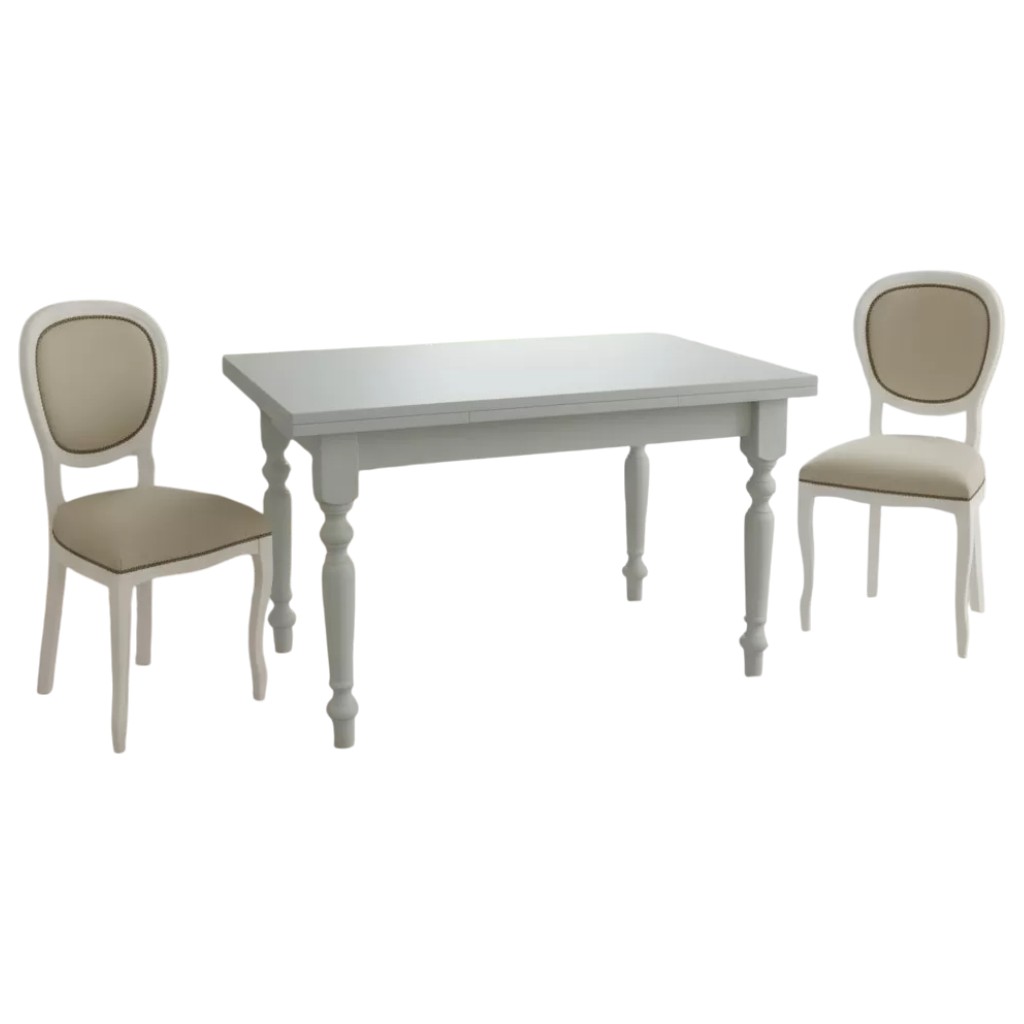 Tavolo costruito in legno massello di pioppo rendendo il mobile solido e robusto. Piano rettangolare con gambe tornite, dotato di due allunghe laterali da 40 cm allungabile con apertura laterale da entrambe i lati, detta anche ' apertura a tiro '. Le allunghe sono riposte sotto il piano pronte all' occorrenza per ospitare numerose persone. Ideale per la zona giorno accompagnato da comode sedie ospitando amici per il pranzo o per la cena.