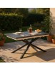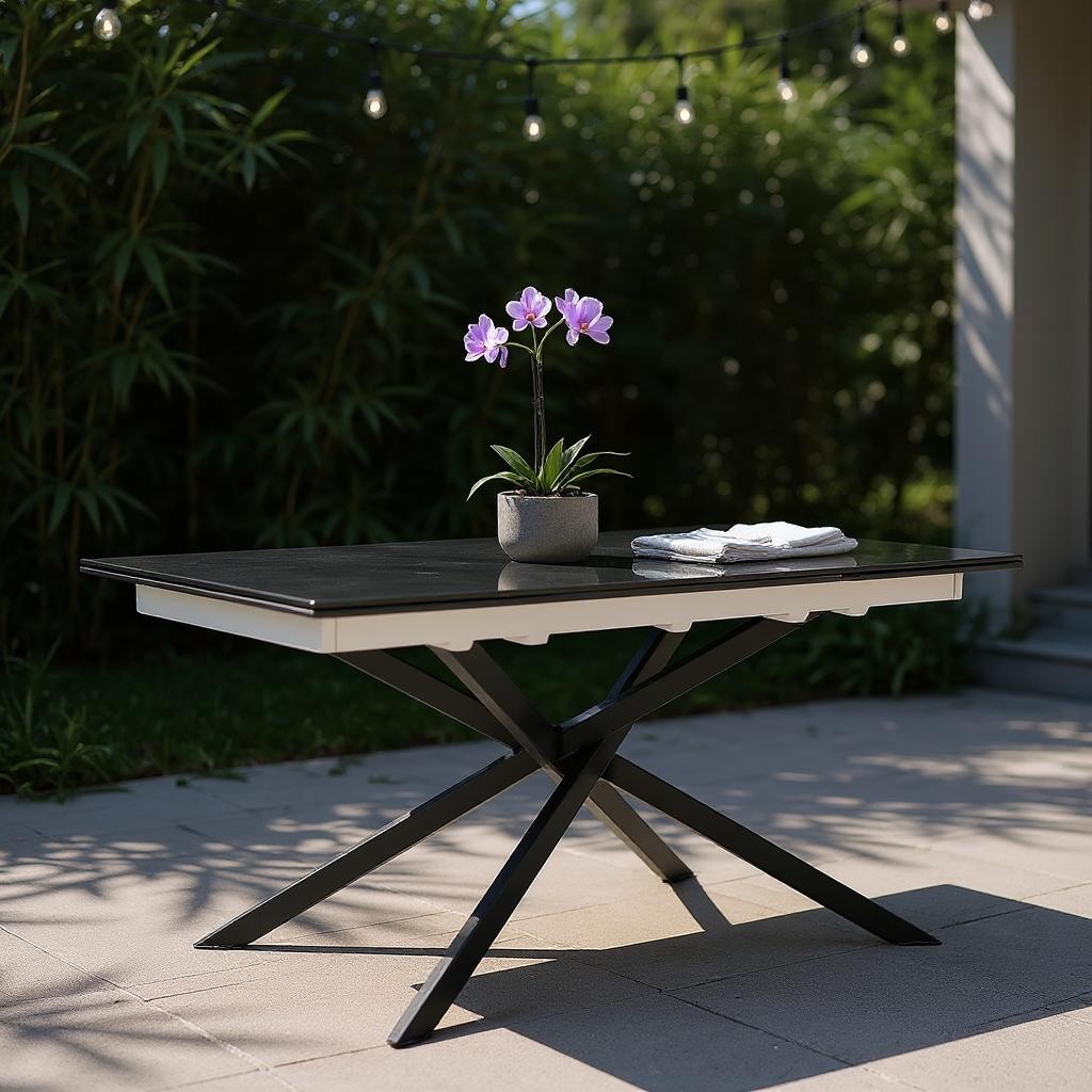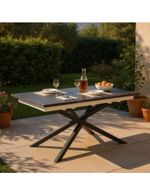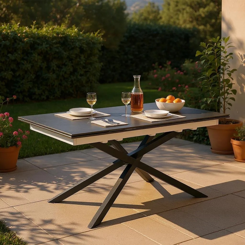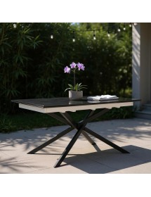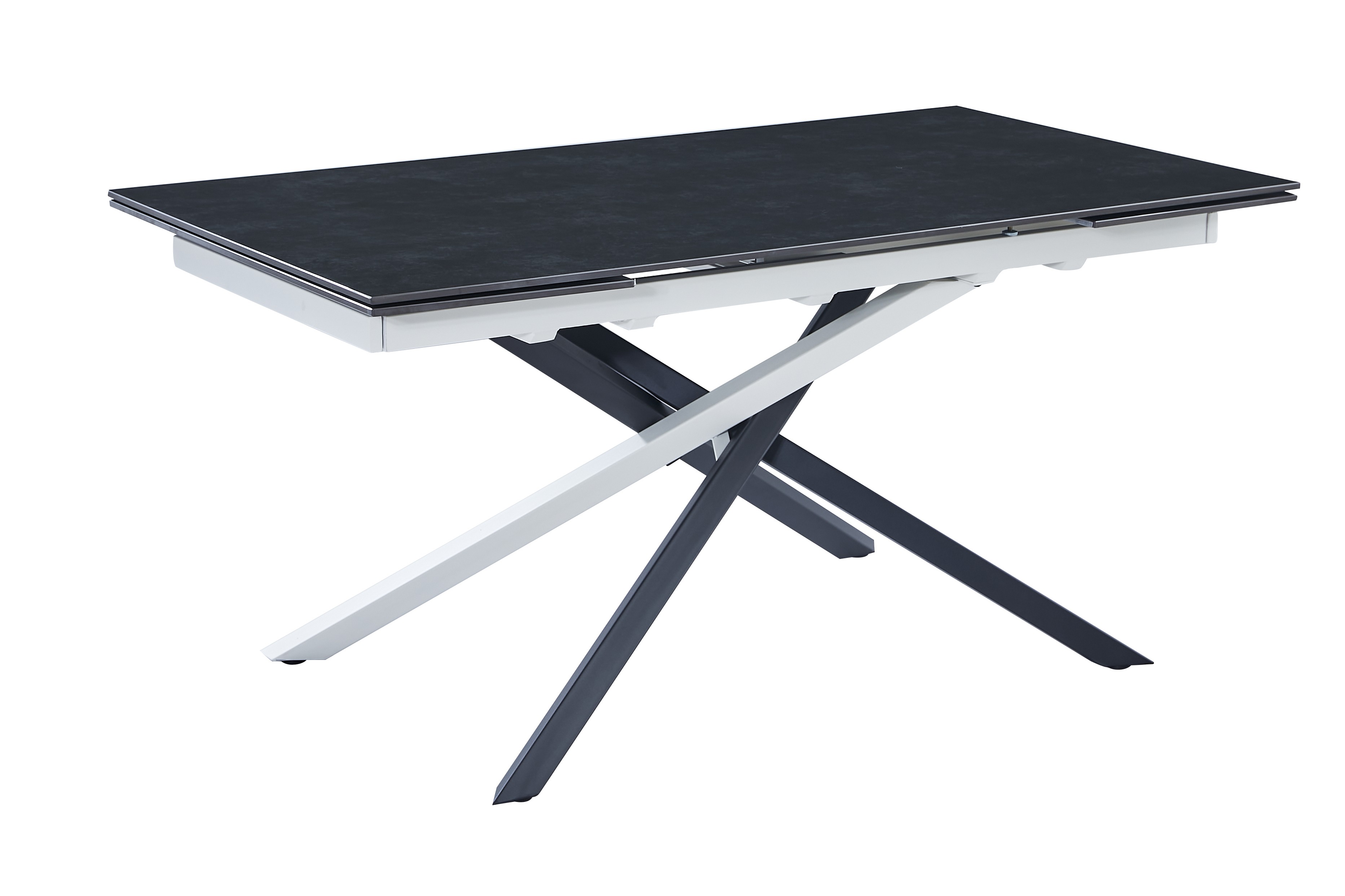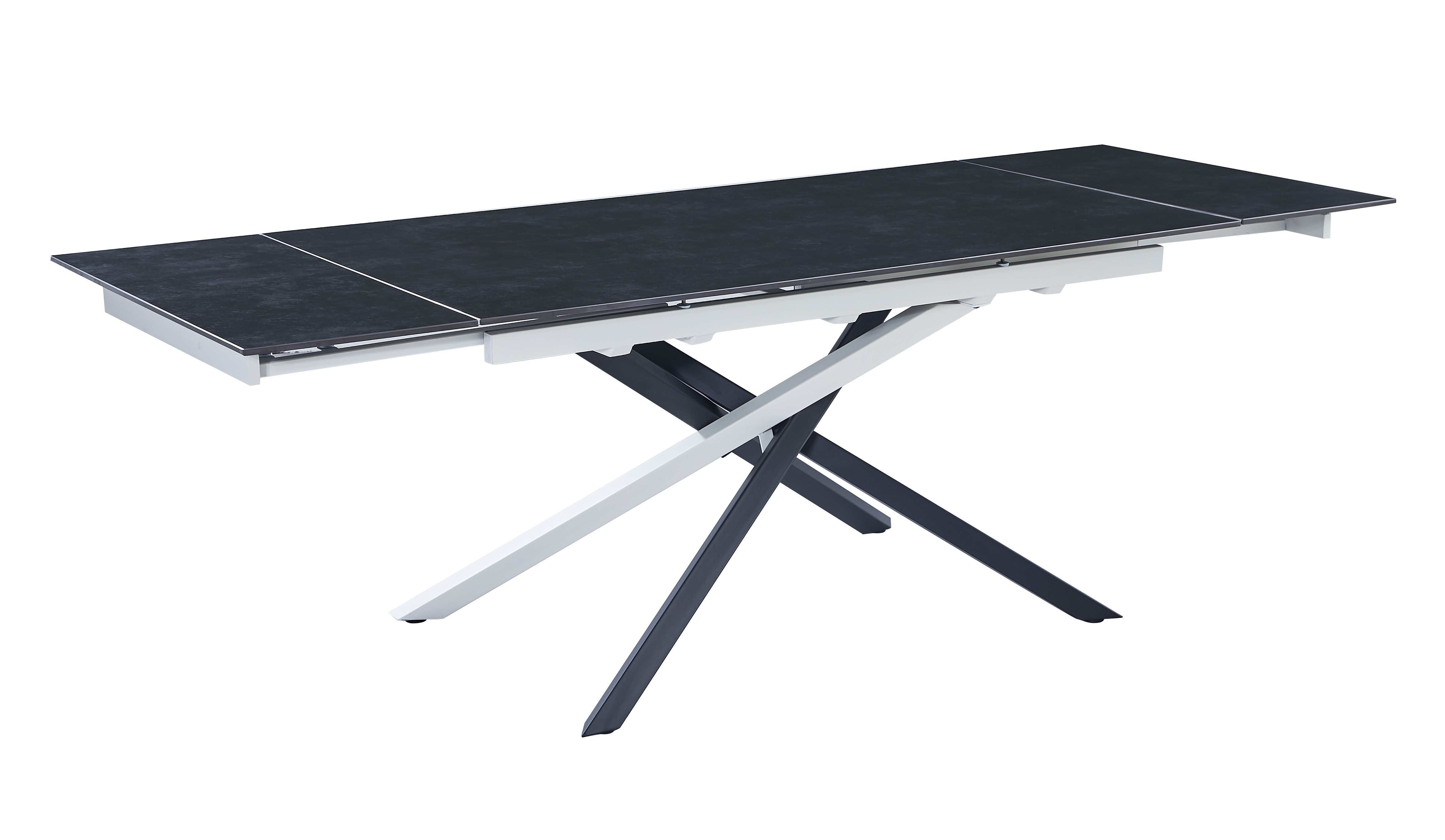 Tavolo moderno allungabile caratterizzato da un piano in pietra sinterizzata originale è innovativa. Si distingue per la sua struttura solida composta da piedi incrociati in acciaio raggiungendo una lunghezza di 240 cm in massima estensione grazie ad un meccanismo di scorrimento su guide in metallo. Ideale per un soggiorno moderno che risalta tutti i dettagli assieme a uno stile esclusivo.