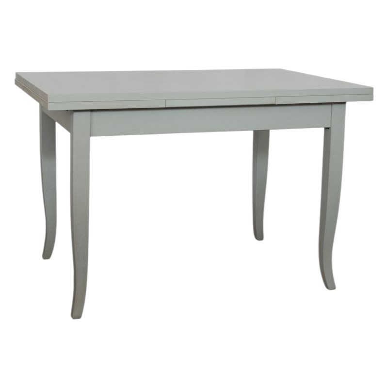 Tavolo costruito in legno massello di pioppo rendendo il mobile solido e allo stesso tempo elegante. Piano rettangolare con gambe a sciabola, dotato di un'apertura laterale da entrambi i lati, detta anche "apertura a tiro", le allunghe sono riposte sotto il piano. Ideale per il soggiorno o in cucina.