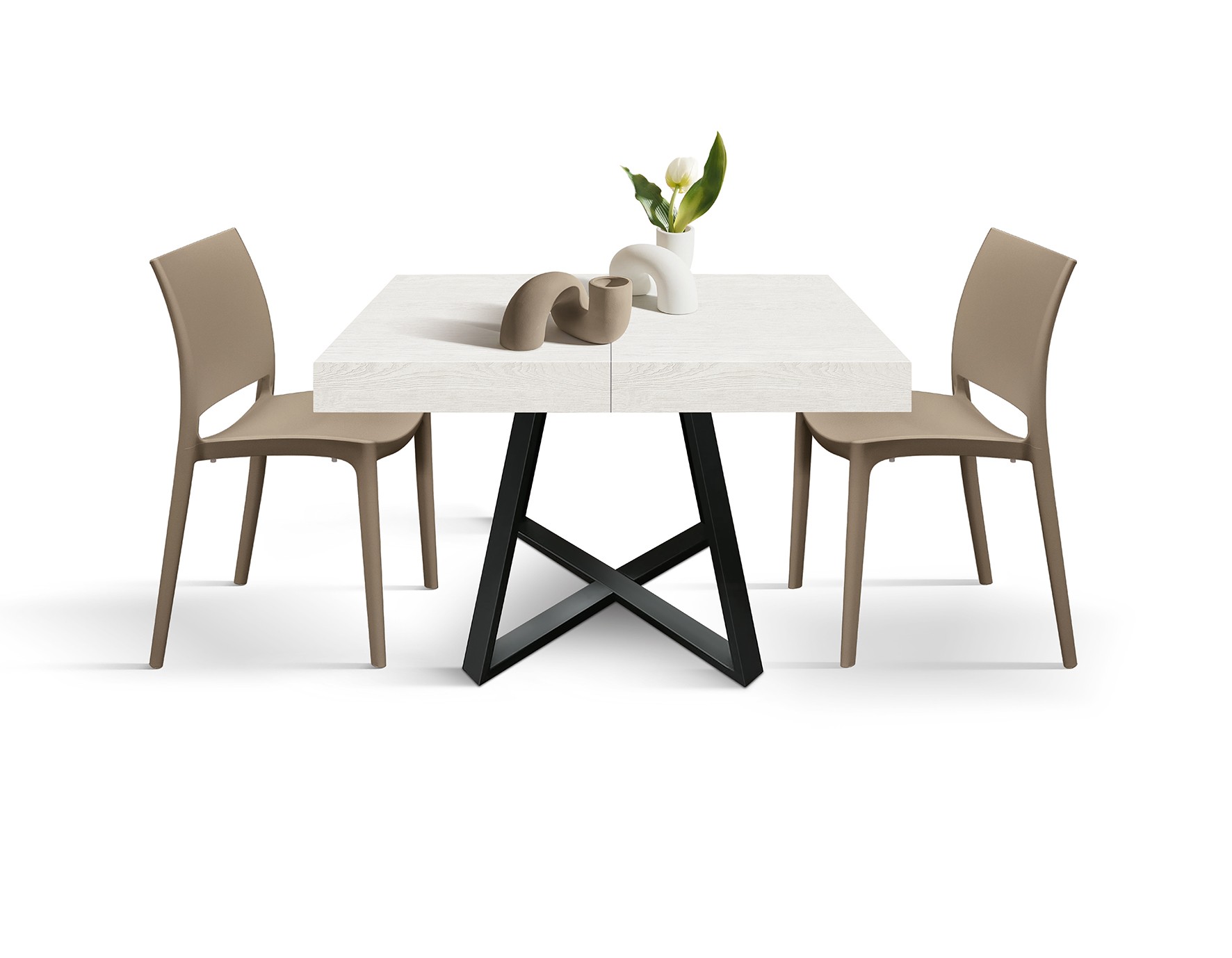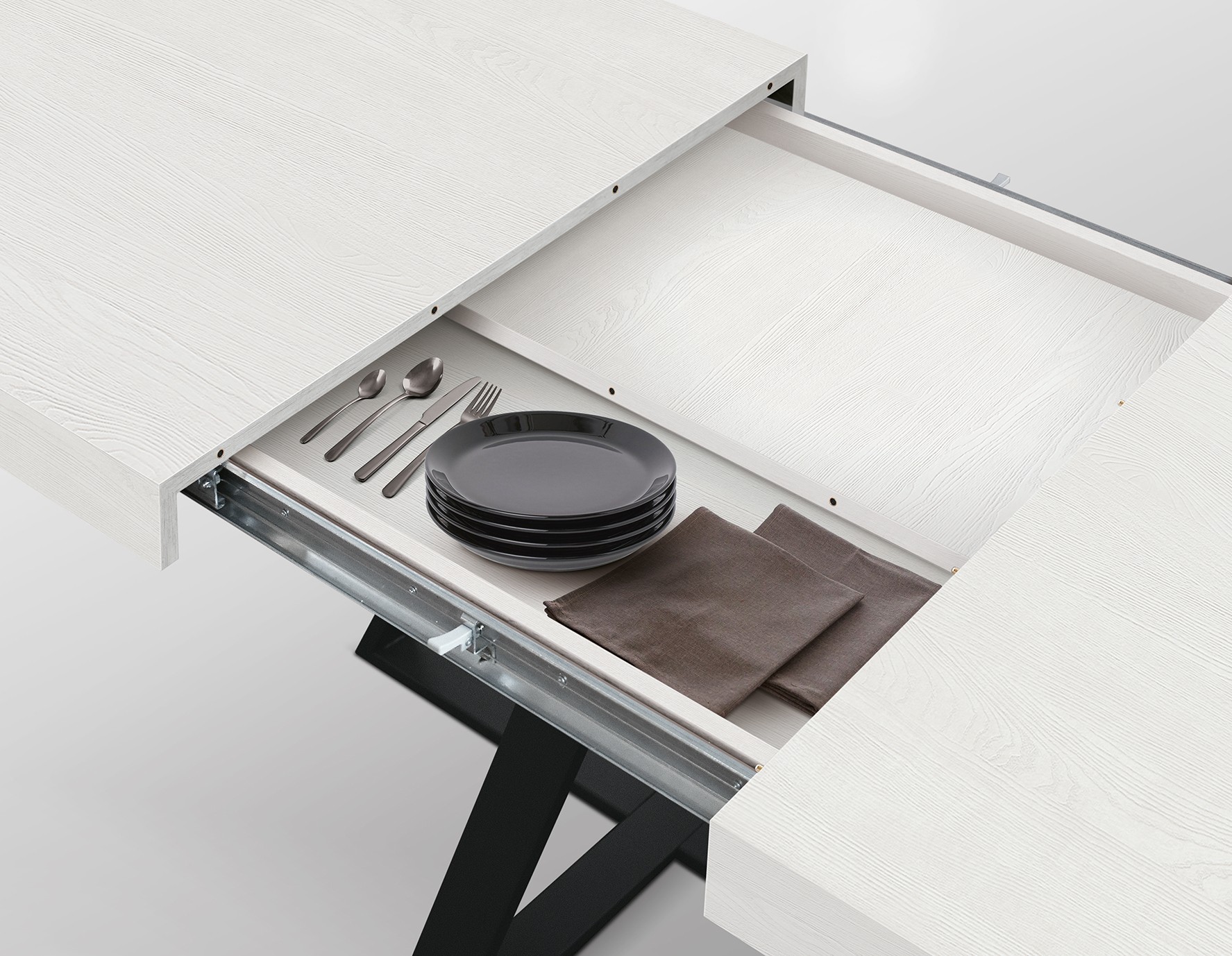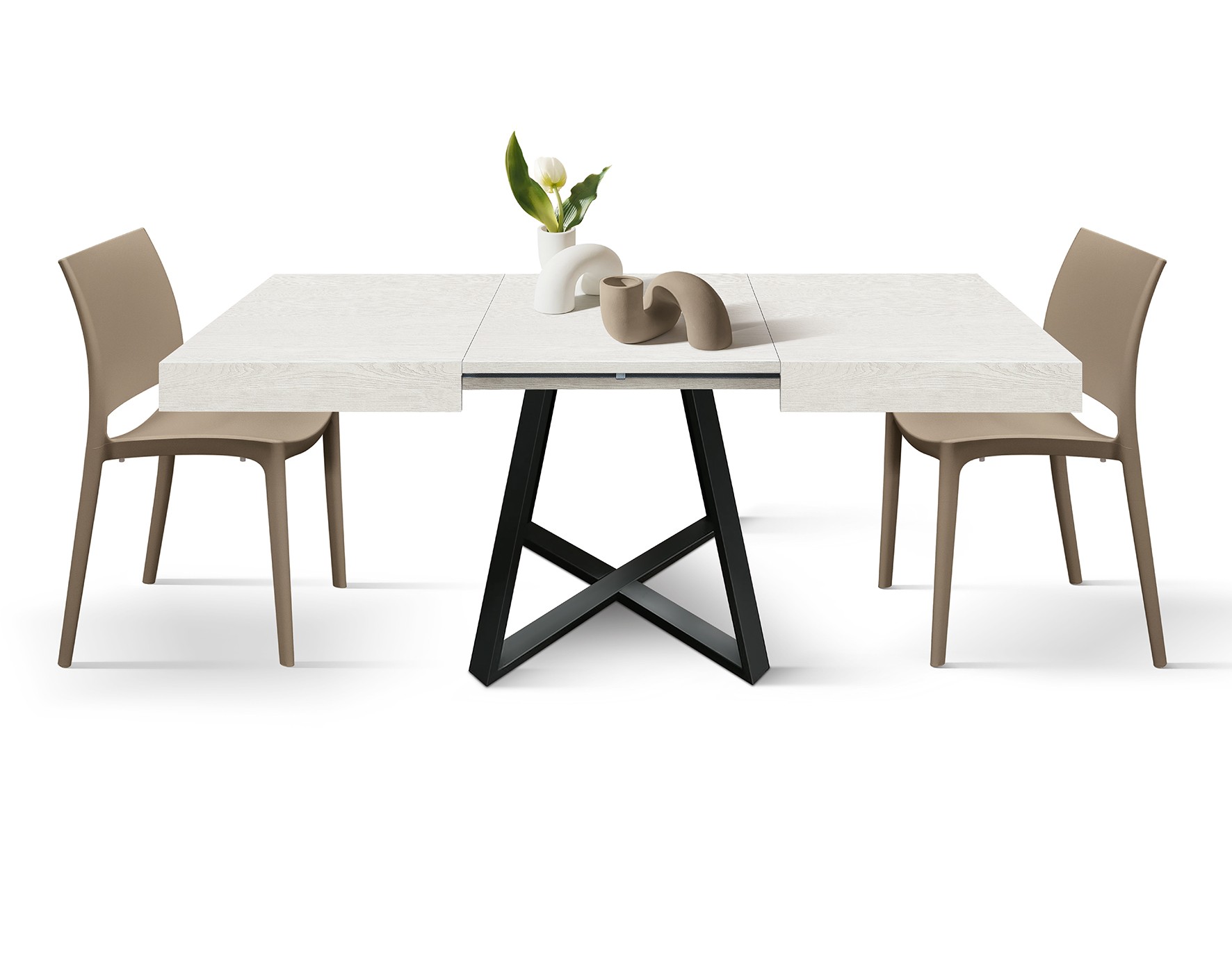 Tavolo allungabile con una linea giovane e dinamica. le gambe oblique e rastrellate alleggeriscono l'impatto visivo e sorreggono il piano composta da materiali solidi e durevoli rendendolo funzionale e pratico all' occorrenza, si trasforma allungandosi con uno scorrimento centrale.