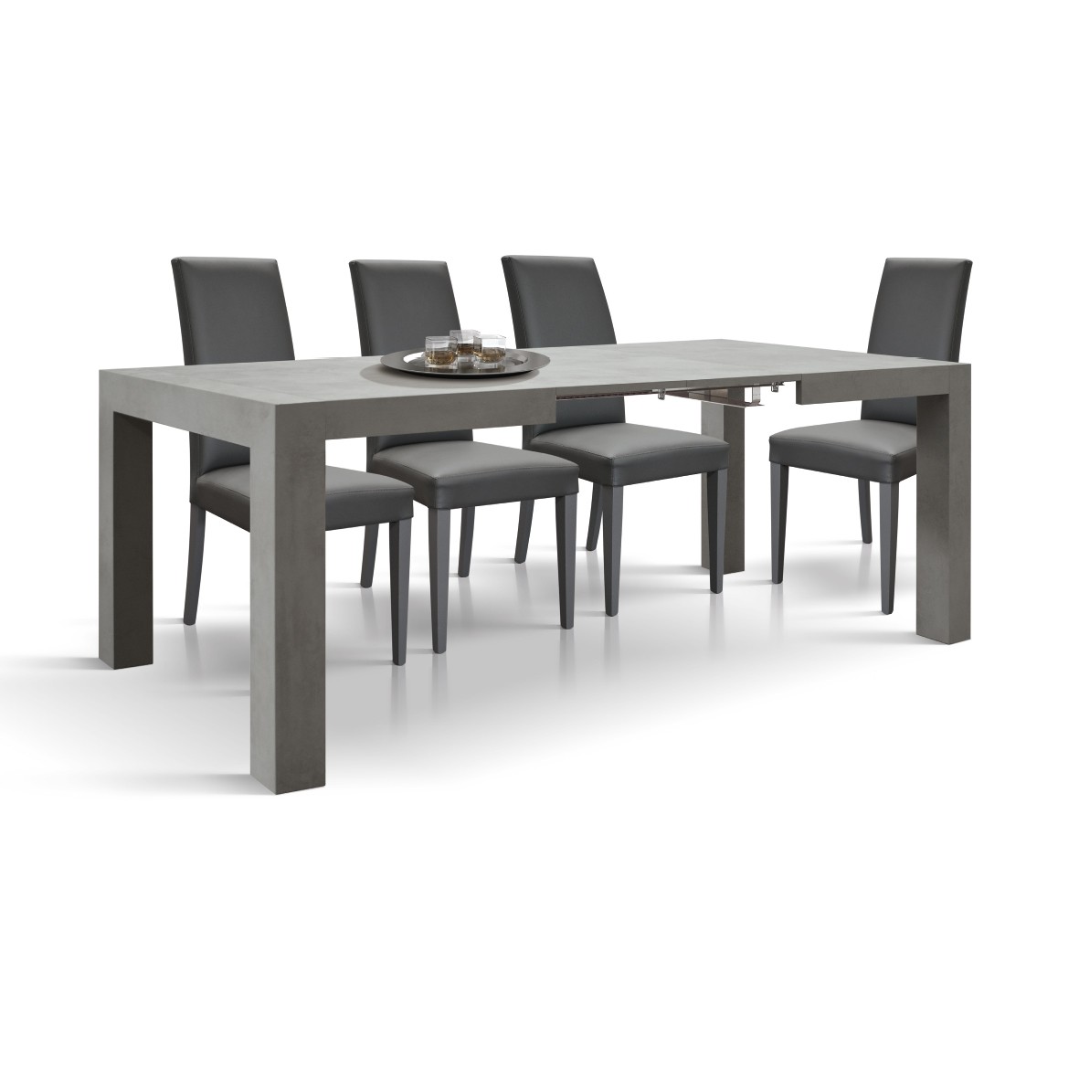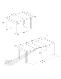 Tavolo allungabile con una linea giovane e dinamica dall' impatto visivo imponente con quattro gambe che sorreggono il piano composto da materiali solidi e duraturi rendendolo funzionale e pratico all’occorrenza, si trasforma allungandosi in maniera pratica e veloce.