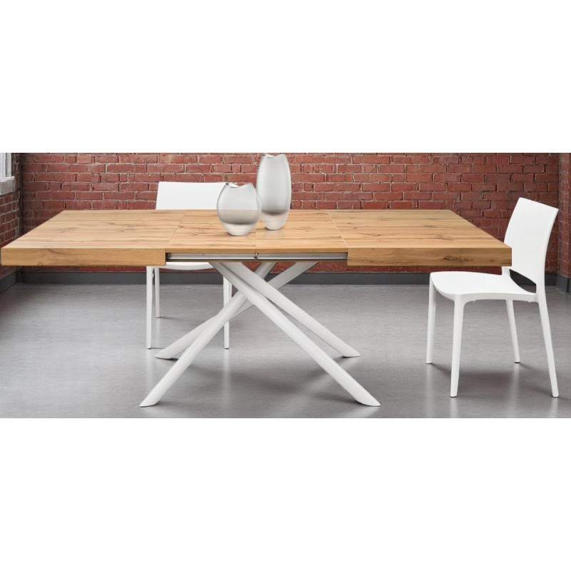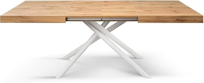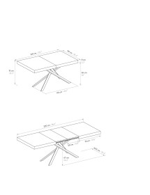 Tavolo moderno allungabile caratterizzato da un piano rettangolare originale è innovativo. Si distingue per la sua struttura solida composta da piedi tubolari in ferro incrociati raggiungendo una lunghezza in massima estensione grazie ad un meccanismo centrale di scorrimento su guide in metallo zincato. Ideale per un soggiorno moderno che risalta tutti i dettagli assieme a uno stile esclusivo.