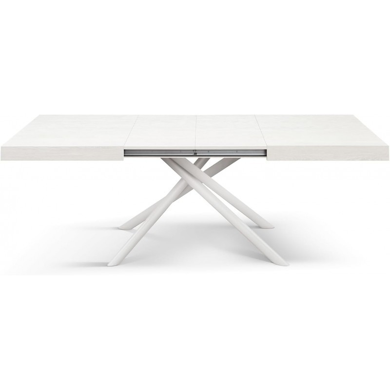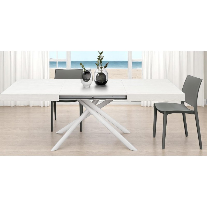 Tavolo moderno allungabile caratterizzato da un piano rettangolare originale è innovativo. Si distingue per la sua struttura solida composta da piedi tubolari in ferro incrociati raggiungendo una lunghezza in massima estensione grazie ad un meccanismo centrale di scorrimento su guide in metallo zincato. Ideale per un soggiorno moderno che risalta tutti i dettagli assieme a uno stile esclusivo.