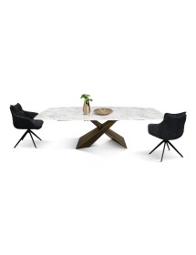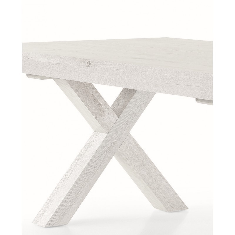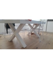 Tavolo con basamento a crocera di pieno impatto e carattere distintivo di questo prodotto.