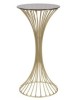 Tavolo rotondo in metallo dorato dalle linee semplici e morbide impreziosite da eleganti sfere. Completo di piano in vetro fumé.