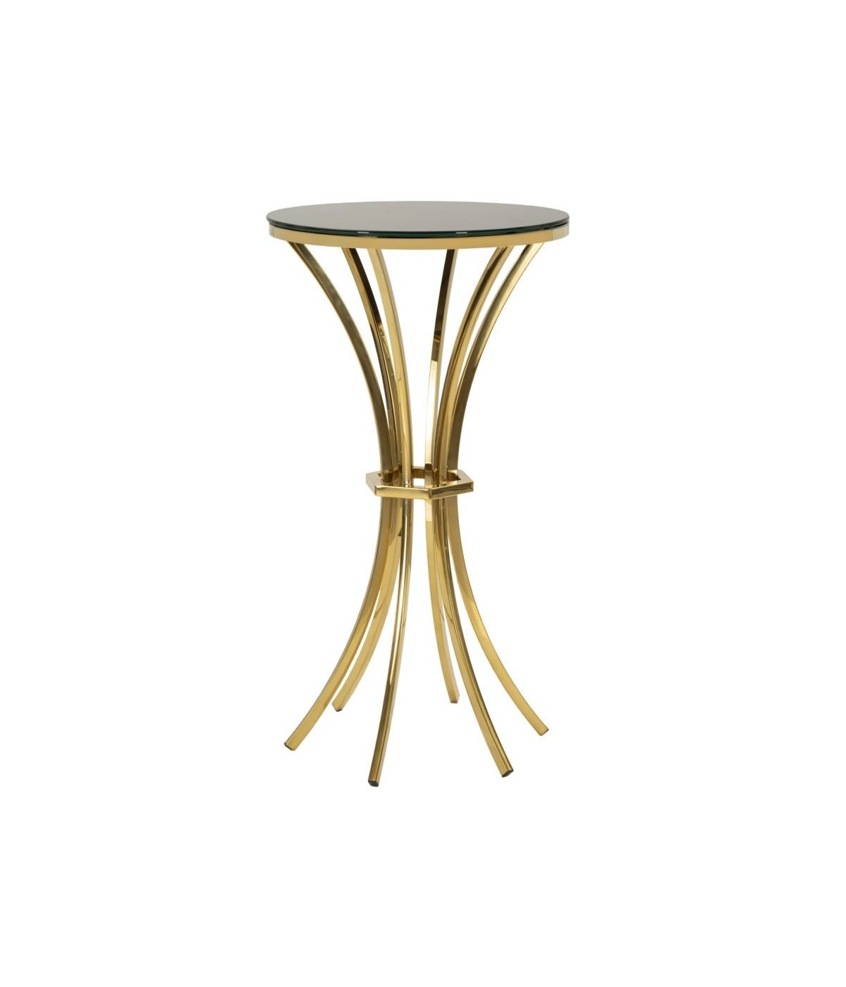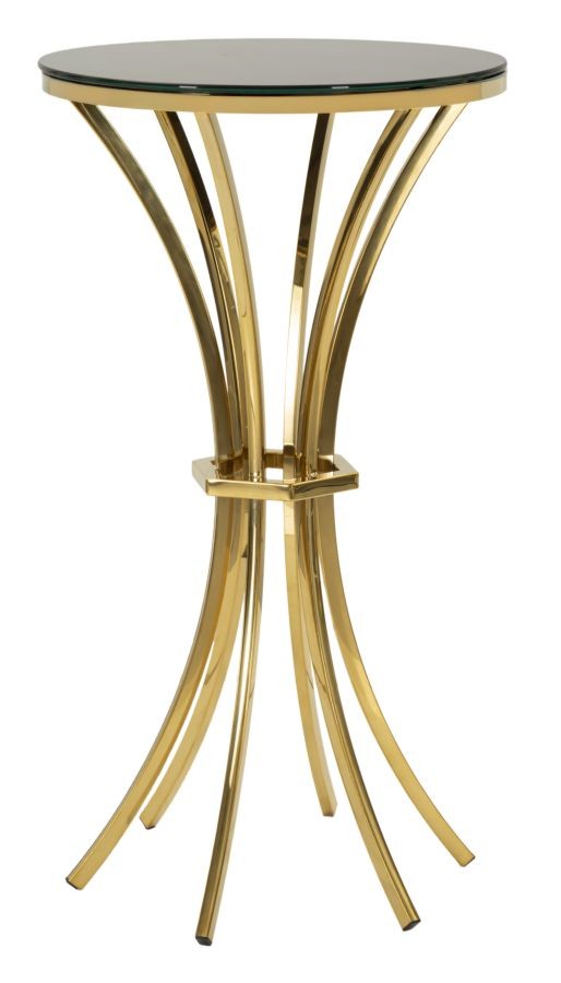 un tavolino alto dallo stile leggero e sofisticato: gambe dorate slanciate e piano in vetro per un tocco elegante e luminoso. Ideale come complemento decorativo in ambienti raffinati.