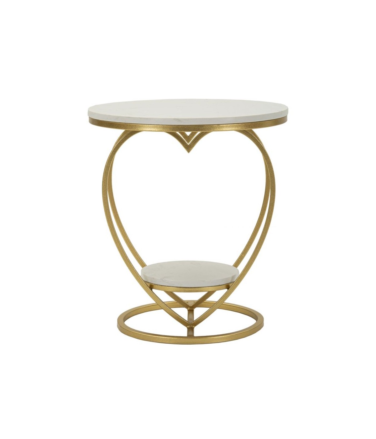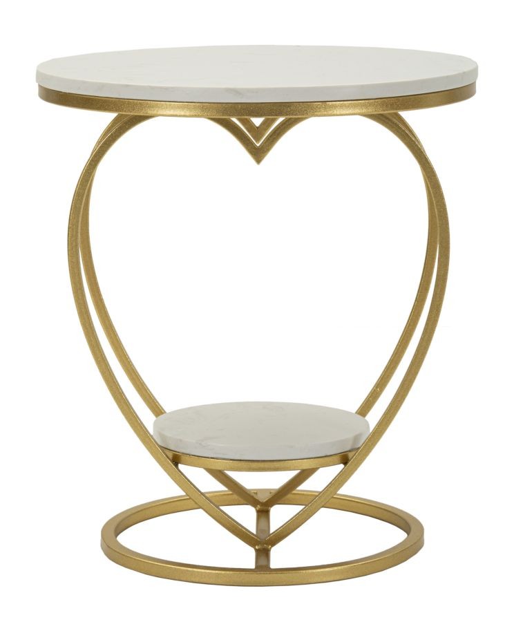 Tavolinetto Heart oro, con elegante struttura a forma di cuore e ripiani effetto marmo. Perfetto per aggiungere un tocco romantico e raffinato a ogni ambiente.