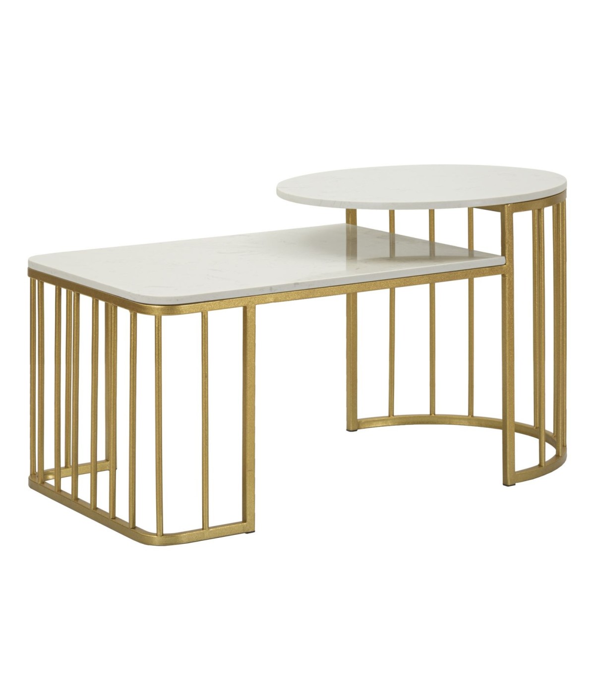 Tavolo da caffè Ankara, linee originali e struttura dorata con piano effetto marmo. Ideale per aggiungere stile a salotti contemporanei.
