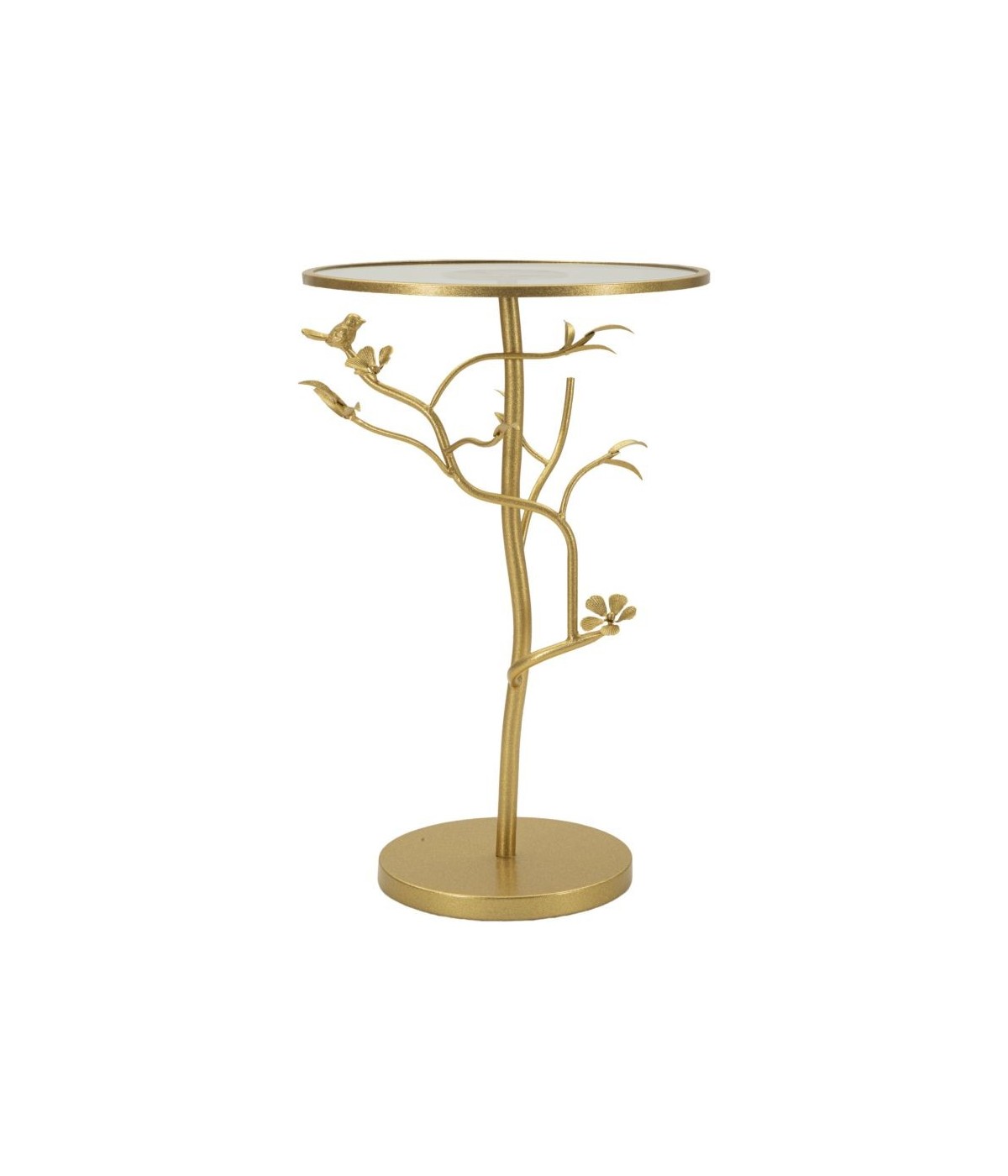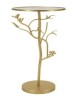Tavolinetto Birds Glass, struttura dorata con rami intrecciati e piano in vetro. Ideale per dare leggerezza e charme ad ambienti sofisticati.