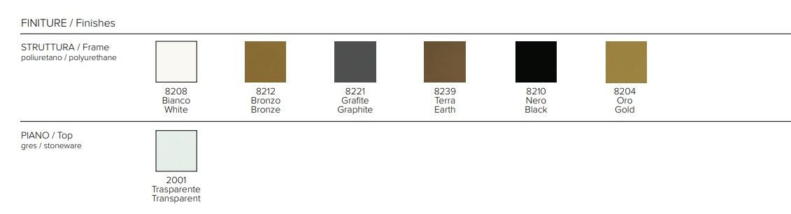 • Materiale base: poliuretano. Colori base disponibili: bianco, grafite, terra, oro, nero, bronzo.