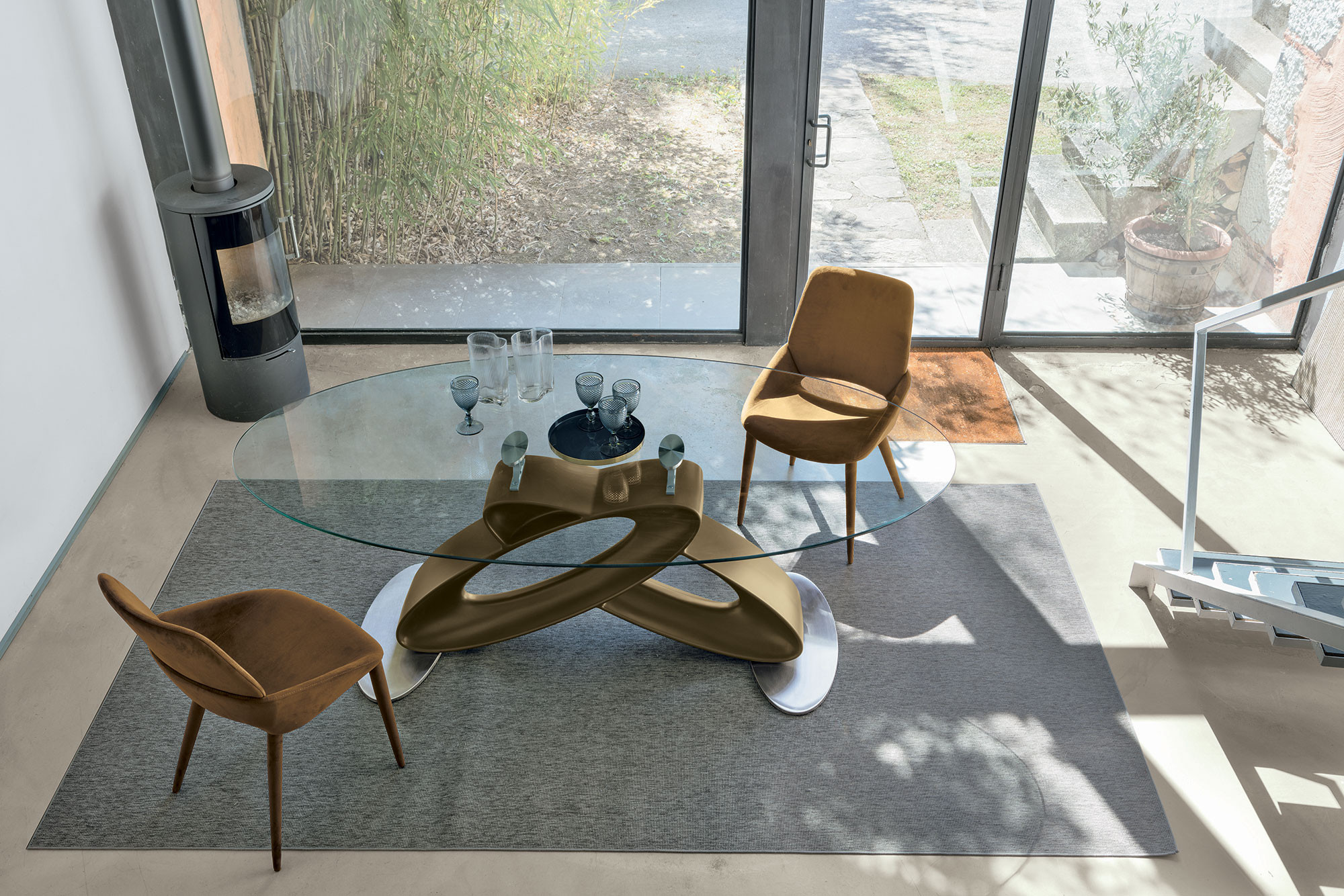 La forma ovale del piano favorisce l’interazione e la convivialità, rendendo questo tavolo perfetto per ambienti living ampi e sofisticati, sale da pranzo moderne o ambienti contract che puntano su un arredo d’autore. L’equilibrio tra volumi pieni e superfici trasparenti valorizza lo spazio, senza appesantirlo.