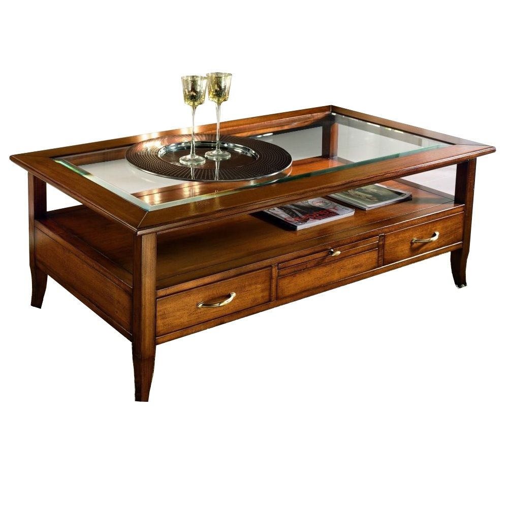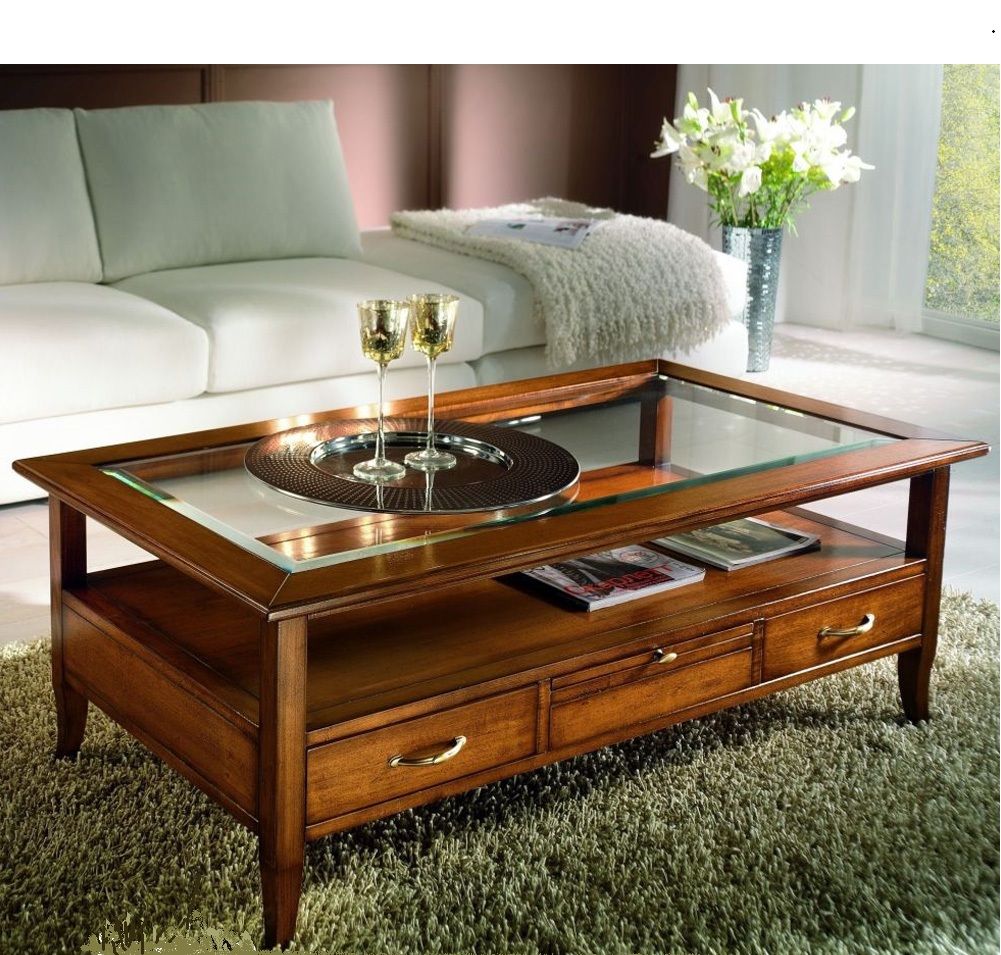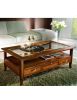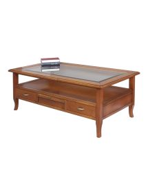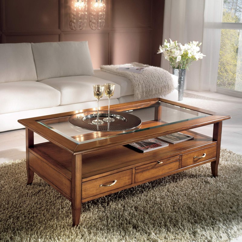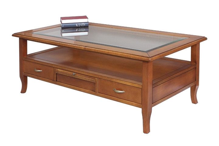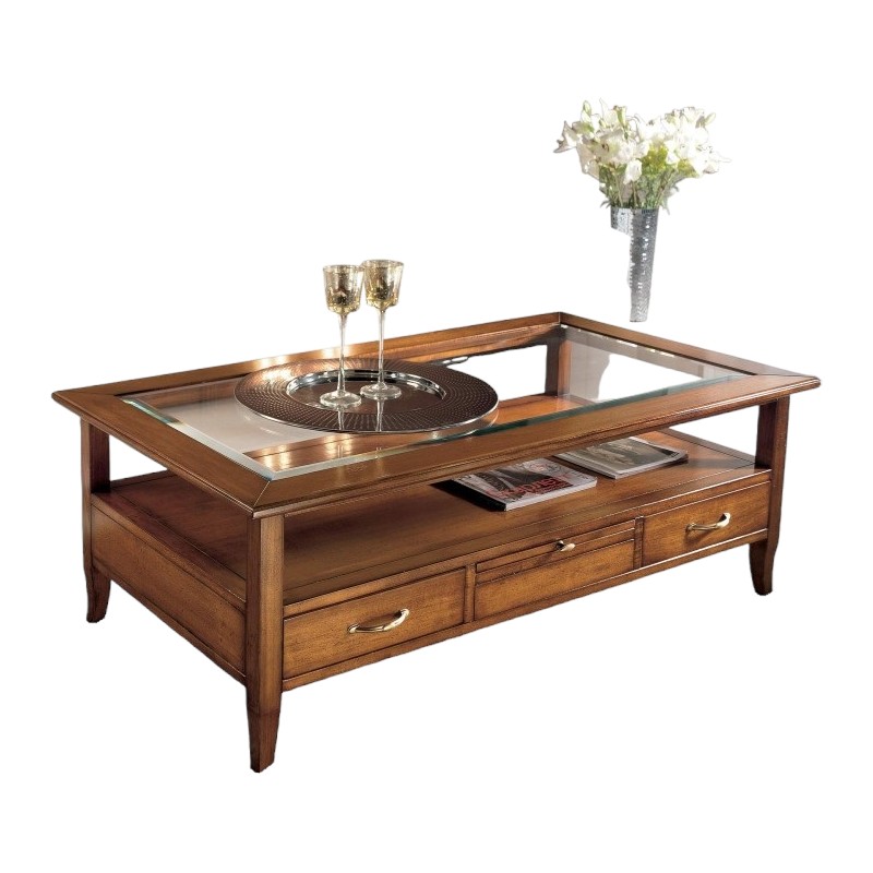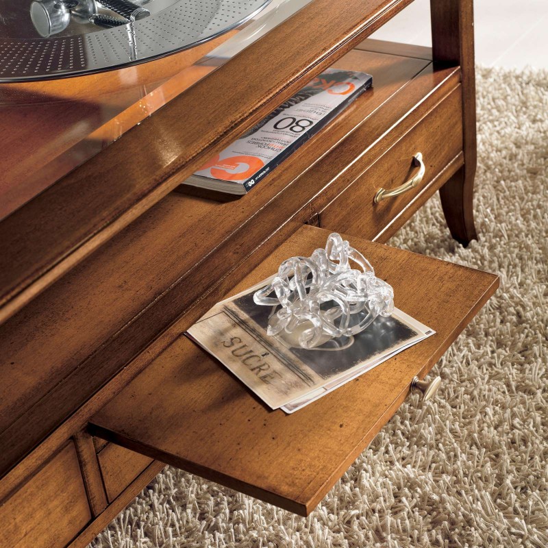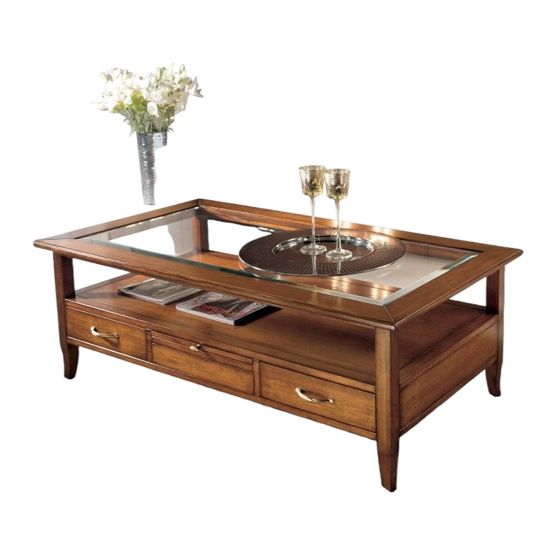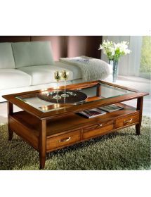 Tavolino classico rettangolare in legno con quattro cassetti e due tiretti che permettono di appoggiare tazzine e bicchieri. Funzionale e pratico con gambe a sciabola che sorreggono un piano in vetro e un ripiano per appoggiare riviste e oggetti. Ideale per la zona giorno affiancato vicino al divano o come complemento d' arredo.