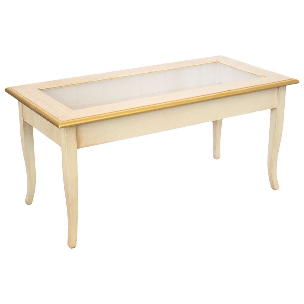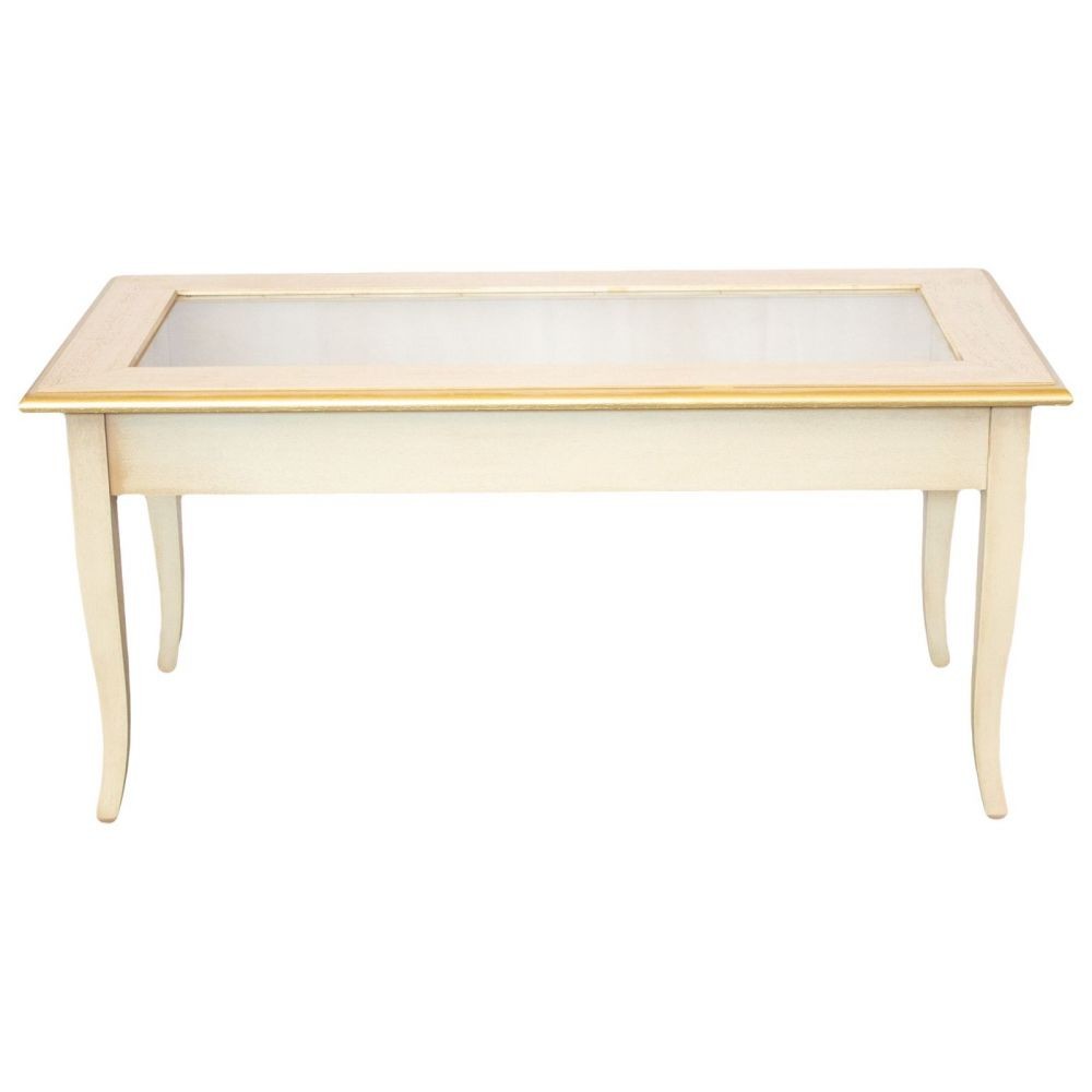 Splendido tavolino bacheca in legno massello con 4 gambe a sciabola realizzato in legno laccato avorio con filo oro. Complemento d' arredo versatile per essere posizionato in qualsiasi stanza della casa. Tavolino con apertura a bacheca dove si può esporre oggetti di piccole dimensioni in bella mostra.