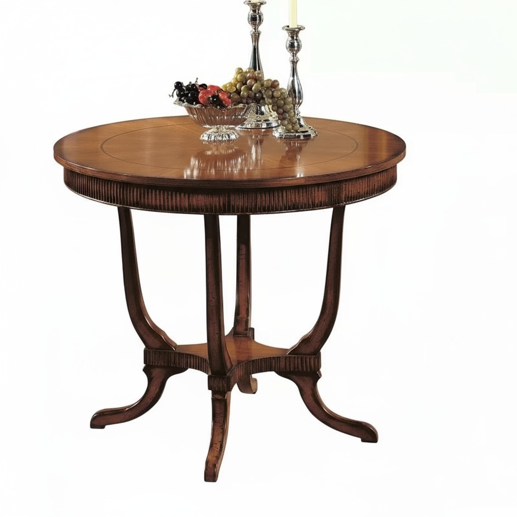 Tavolino rotondo costruito in legno massello, quattro gambe arcuate con gambone centrale che sostengono un ripiano intarsiato. Funzionale e pratico, dotato di un piano d' appoggio intarsiato per appoggiare sopramobili e porta foto. Ideale per la zona giorno o come mobile per l' entrata.