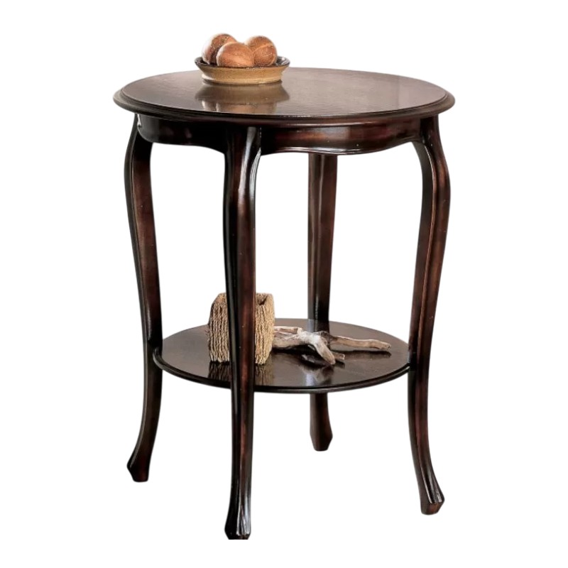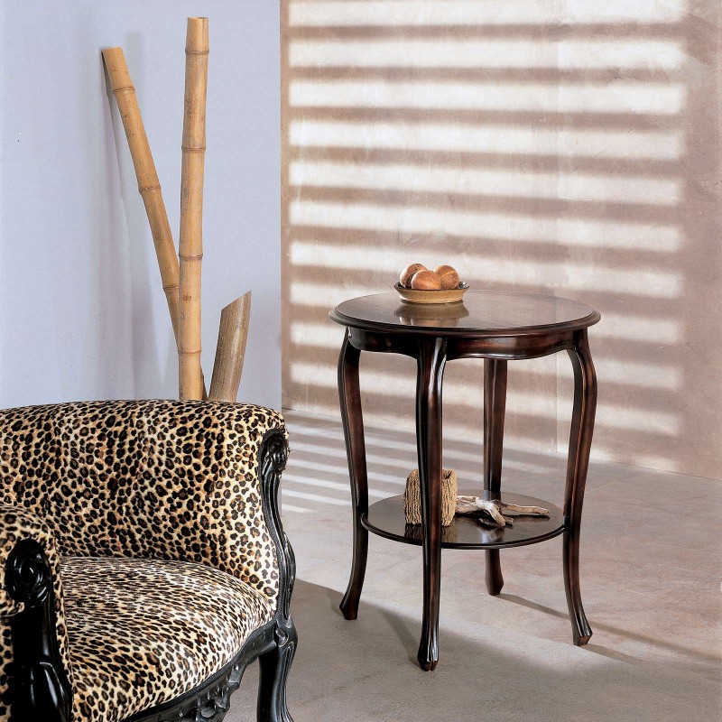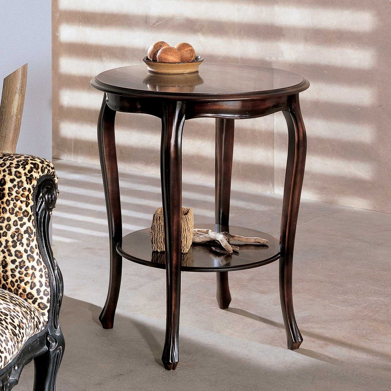 Tavolino rotondo costruito in legno massello, quattro gambe arcuate che sostengono un ripiano nella parte bassa . Funzionale e pratico, dotato di un piano d' appoggio per appoggiare sopramobili e porta foto. Ideale per la zona giorno o come mobile per l' entrata.