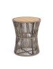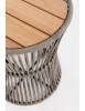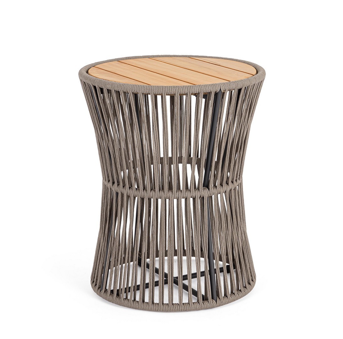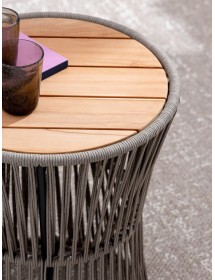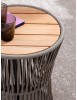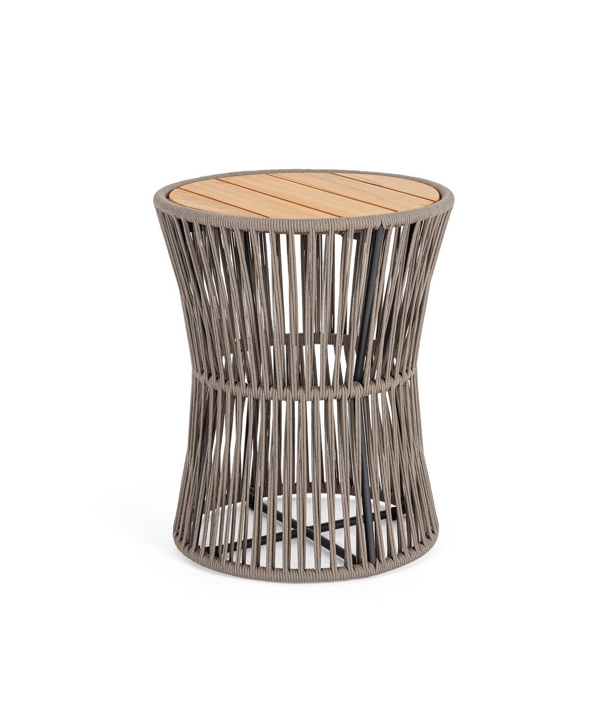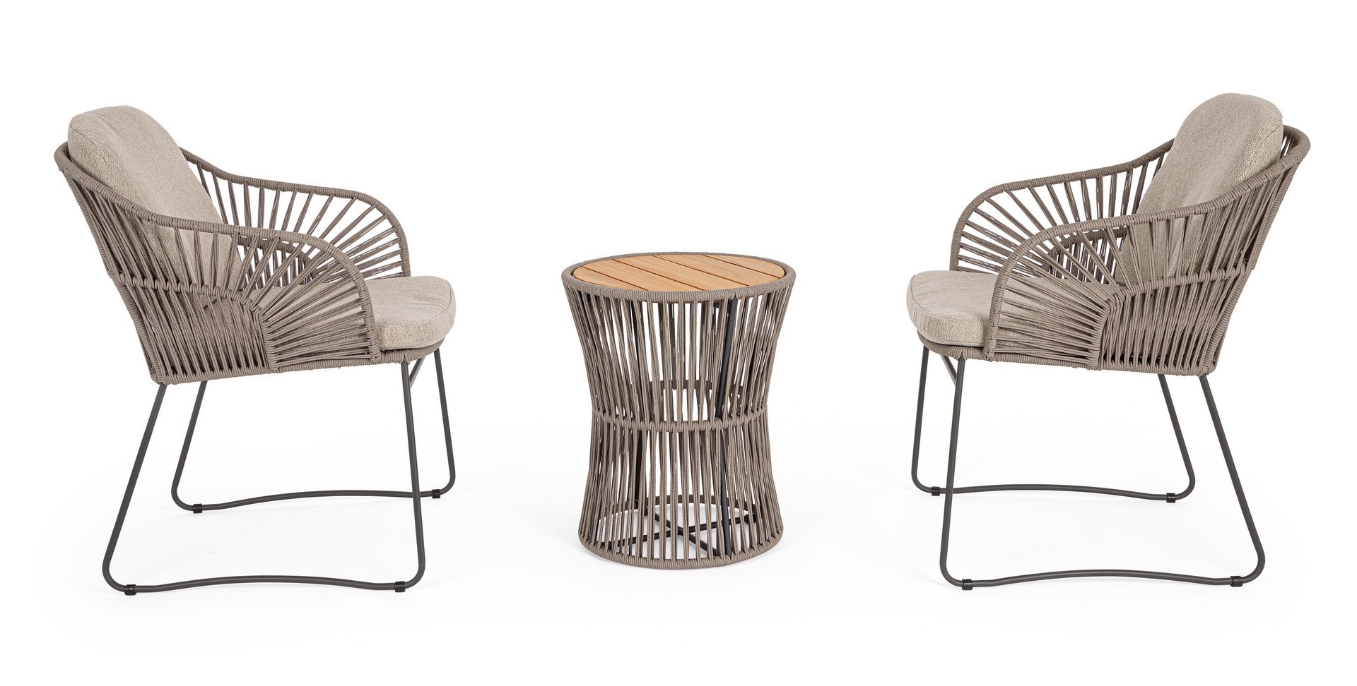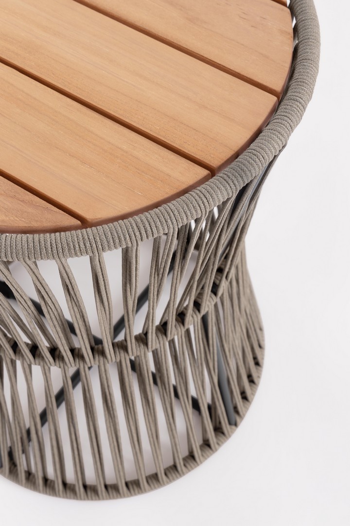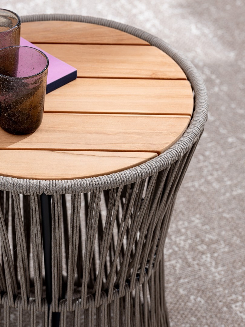 STRUTTURA IN ACCIAIO INOSSIDABILE (201). INTRECCIO PER ESTERNO IN CORDA (POLIPROPILENE). PIANO IN TEAK - SVLK (LEGNO CERTIFICATO PROVENIENTE DA FORESTE SOSTENIBILI). PER EVITARE FENOMENI DI CORROSIONE, SI SCONSIGLIA DI POSIZIONARE MOBILI CON STRUTTURA IN ACCIAIO INOSSIDABILE 201 IN LUOGHI AD ALTA SALINITÀ ( AMBIENTI MARINI ).