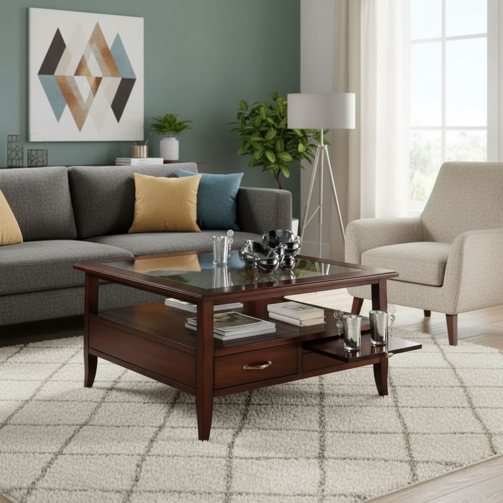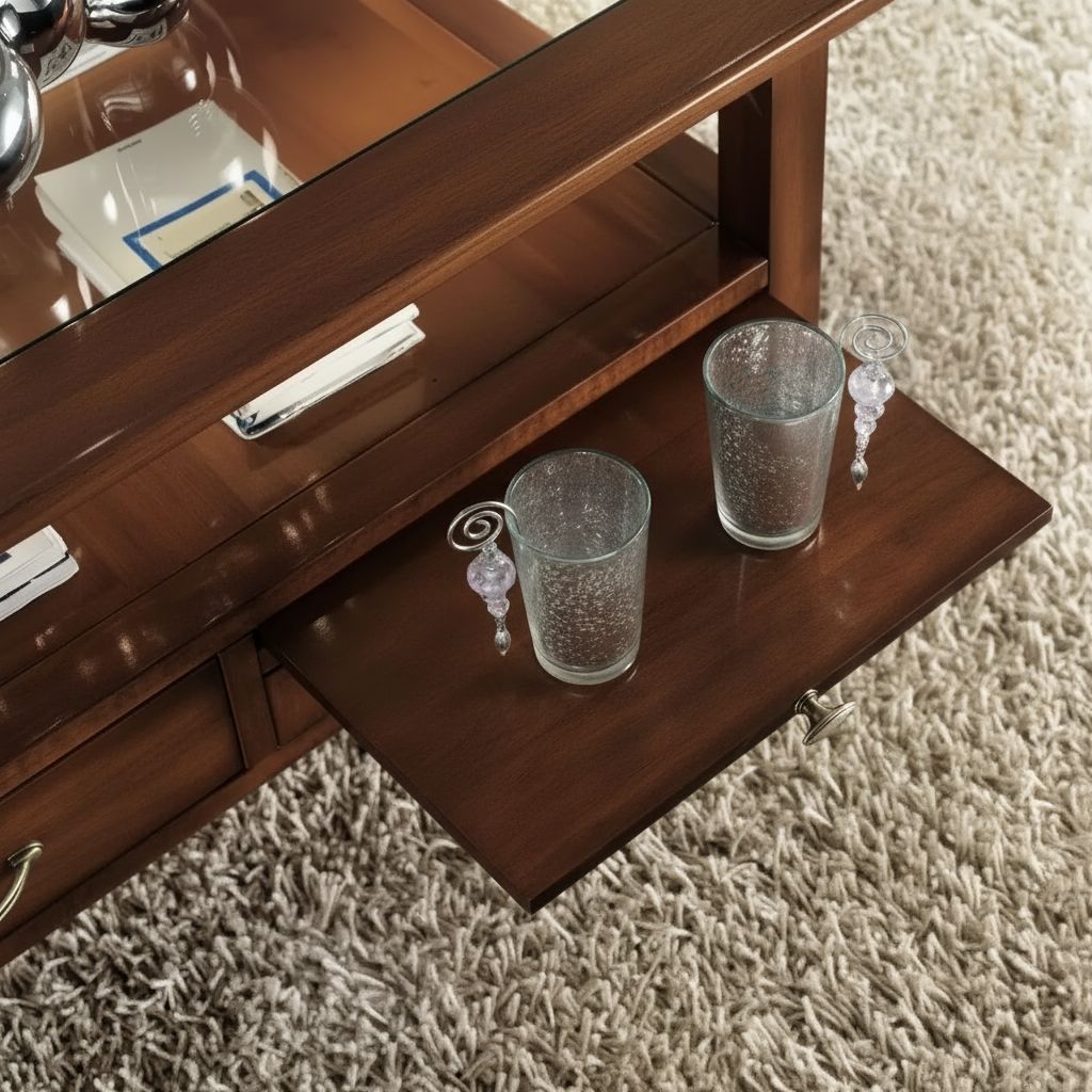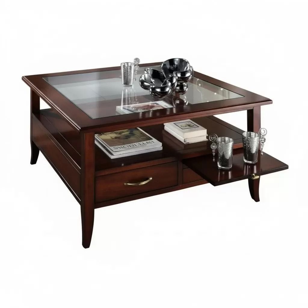 Tavolino classico quadrato in legno con due cassetti e due tiretti che permettono di appoggiare tazzine e bicchieri. Funzionale e pratico con gambe a sciabola che sorreggono un piano in vetro e un ripiano per appoggiare riviste e oggetti. Ideale per la zona giorno affiancato vicino al divano o come complemento d' arredo.