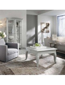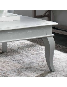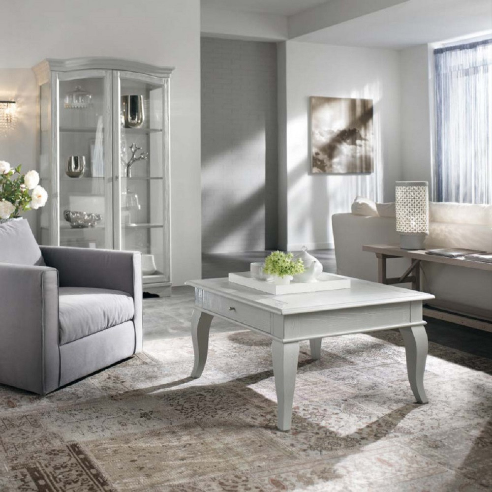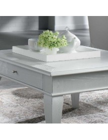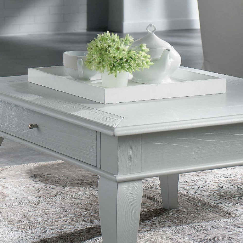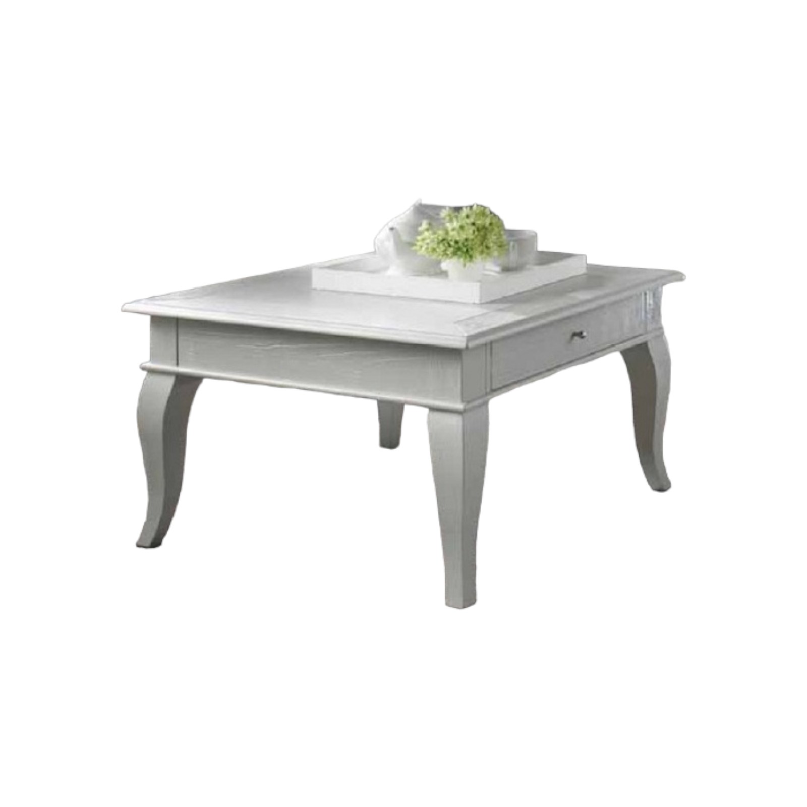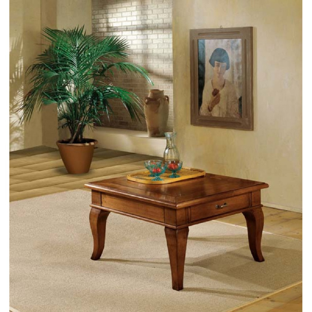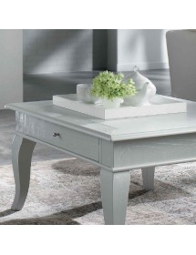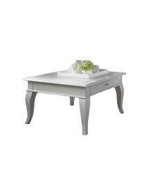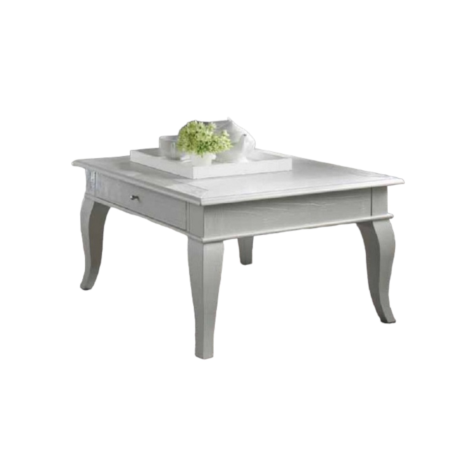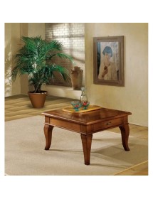 Tavolino da salotto quadrato con un cassetto, gambe sagomate e piano con profilo sporgente. Si caratterizza per la costruzione completamente in legno massello .