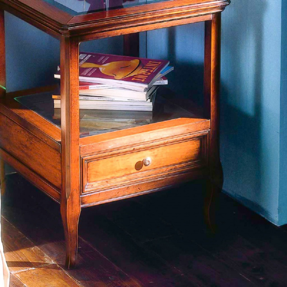 TAVOLINO CLASSICO VETRO E LEGNO 1 CASSETTO FINITURA BASSANO L.55 P.55 H.70