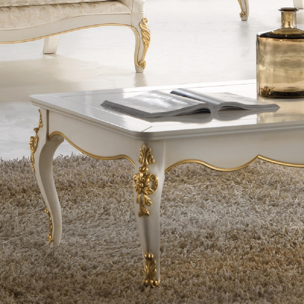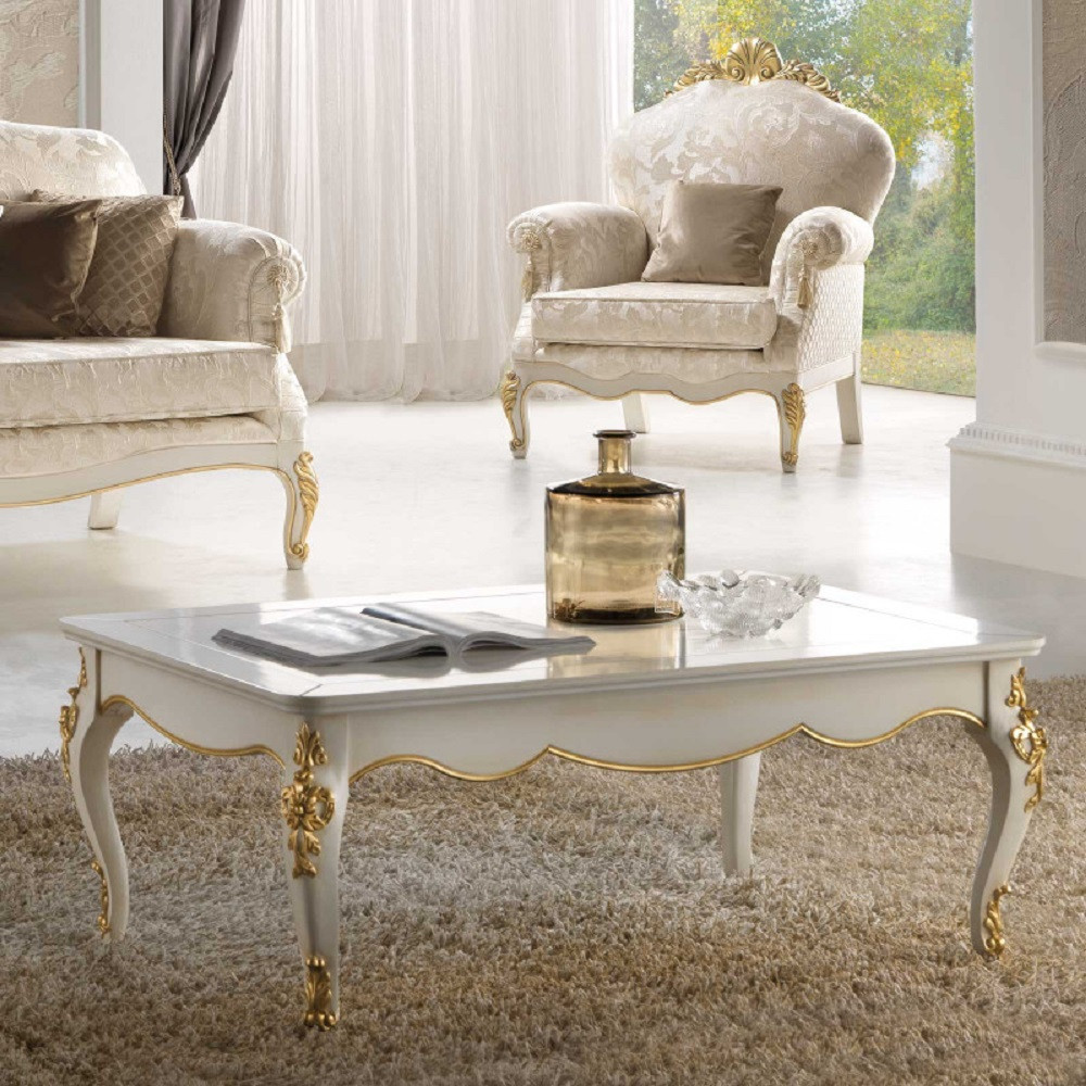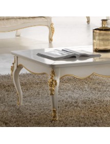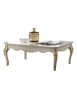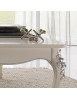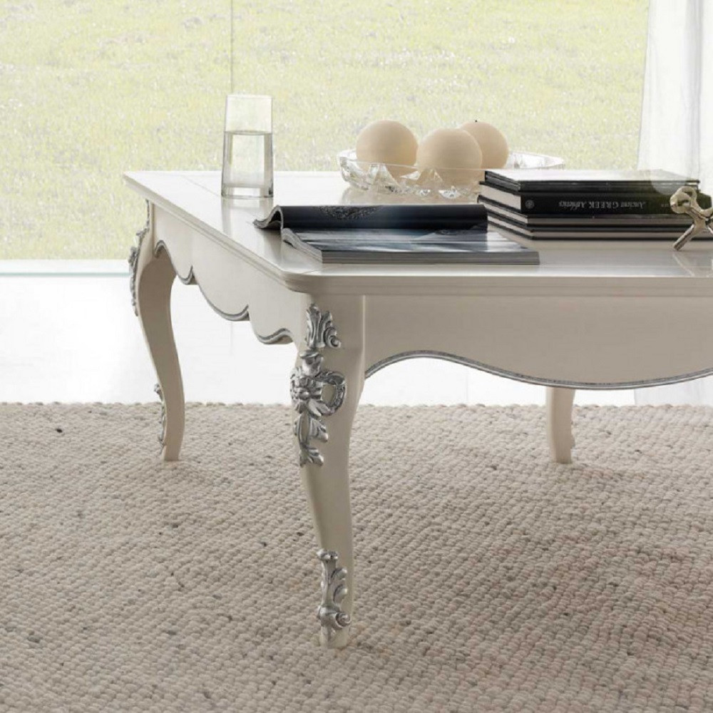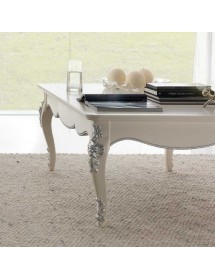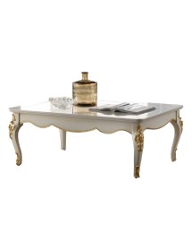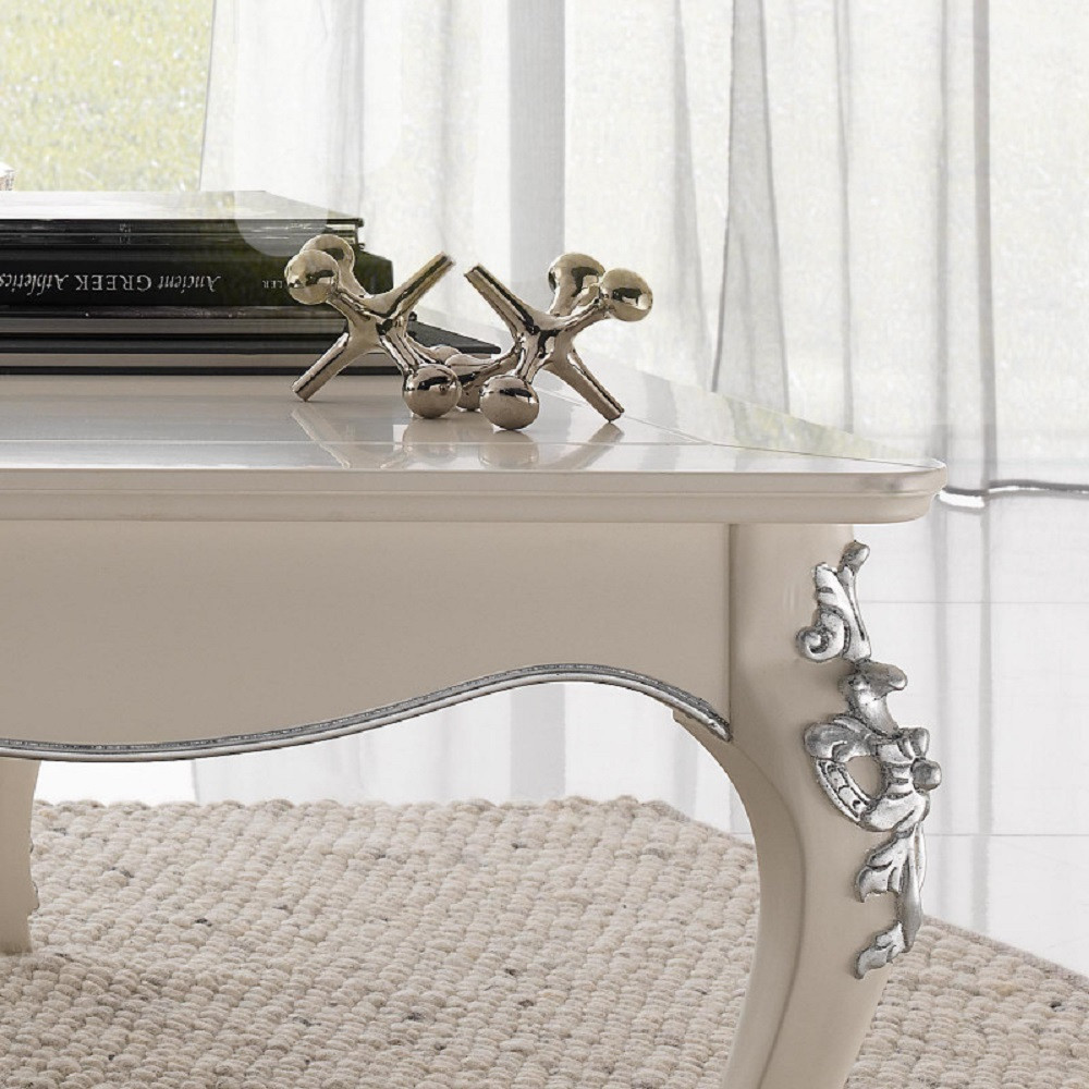 Elegante e raffinato tavolino da salotto. Gambe sagomate ed intagliate, piano con cornice ed angoli arrotondati. Le forme delicate ma importanti sono decorate da dettagli intagliati in foglia oro o argento applicata manualmente da persone esperte.