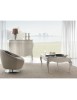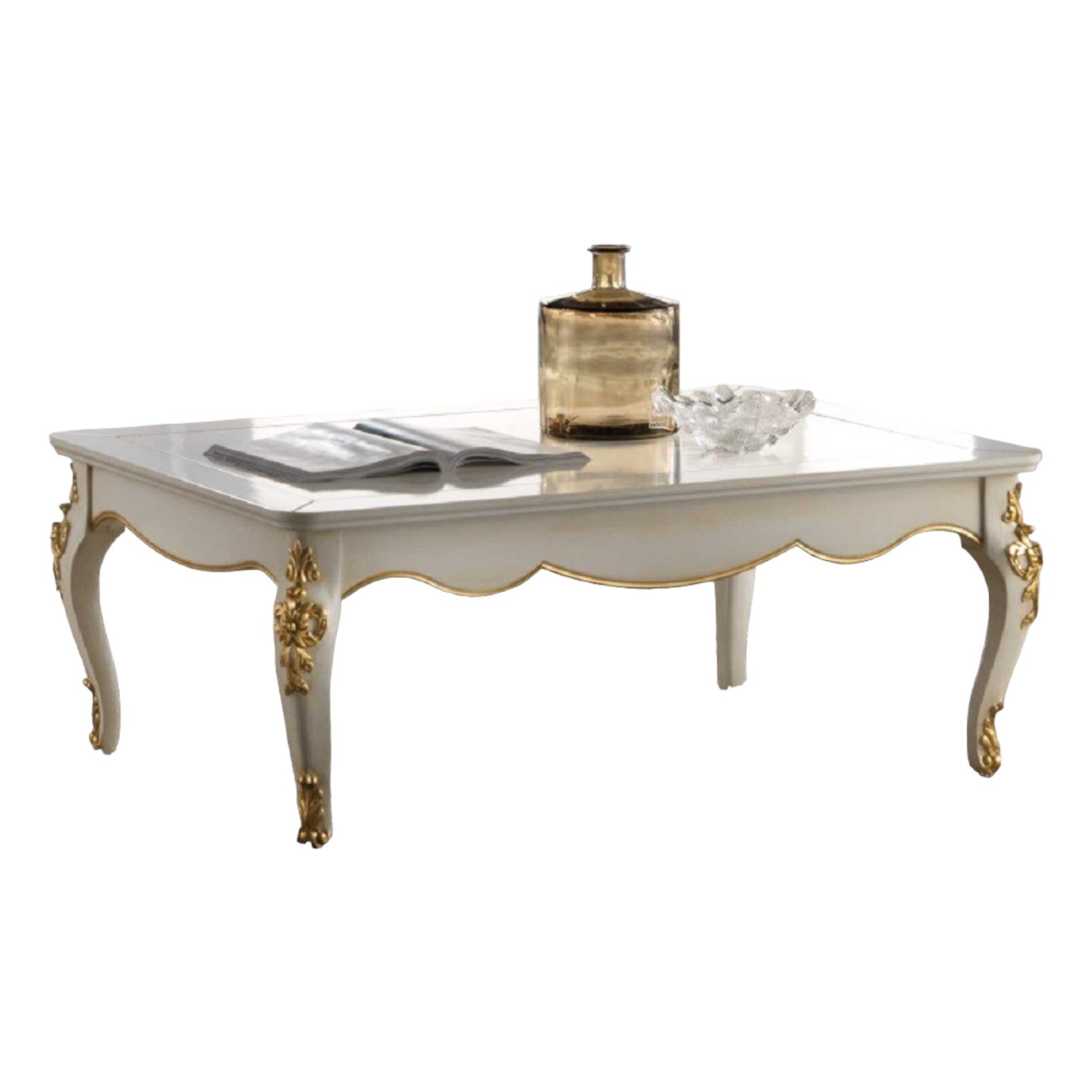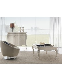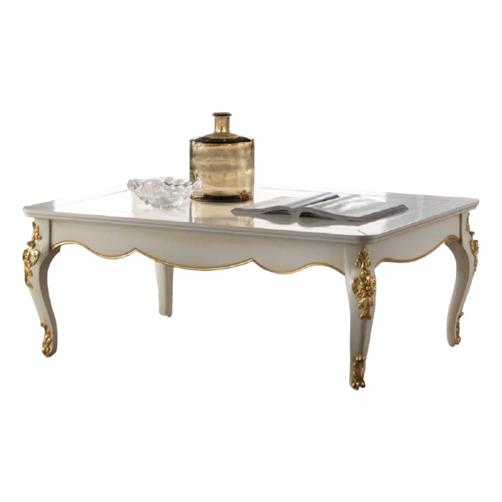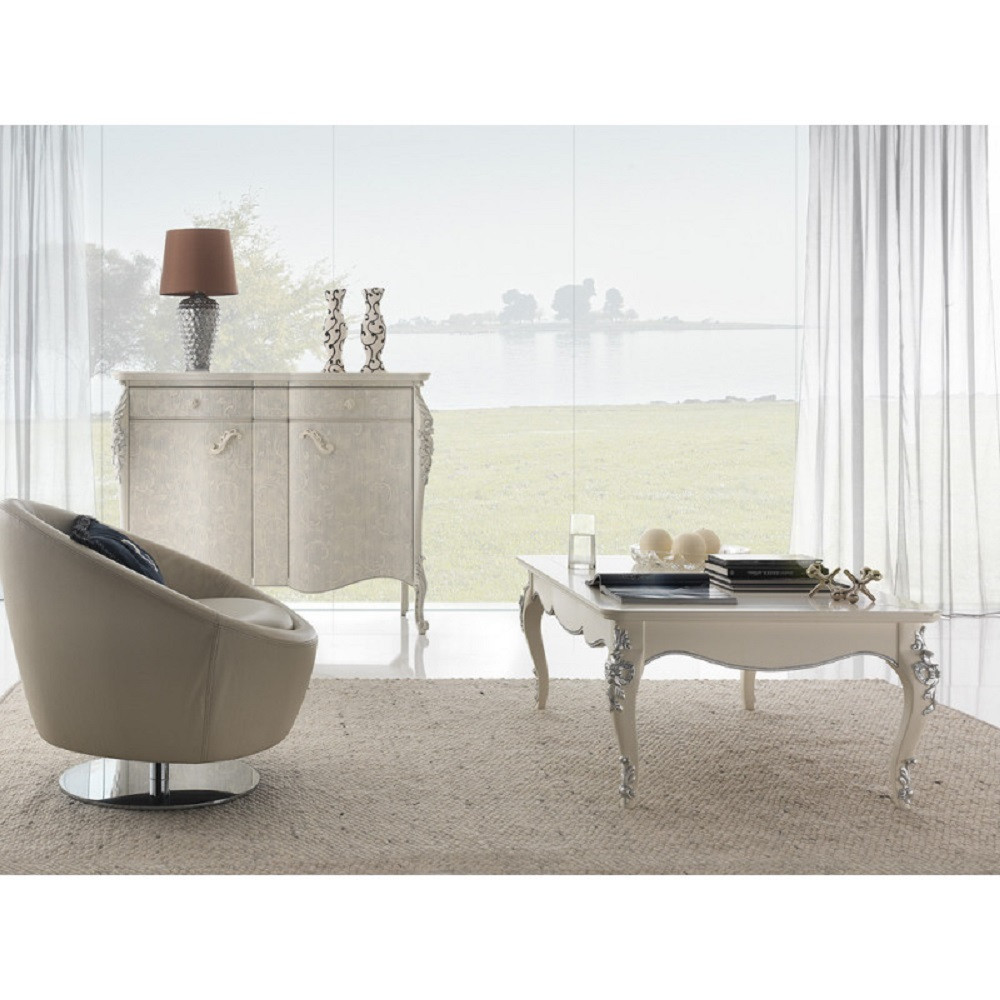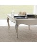 Elegante e raffinato tavolino da salotto. Gambe sagomate ed intagliate, piano con cornice ed angoli arrotondati. Le forme delicate ma importanti sono decorate da dettagli intagliati in foglia oro o argento applicata manualmente da persone esperte.