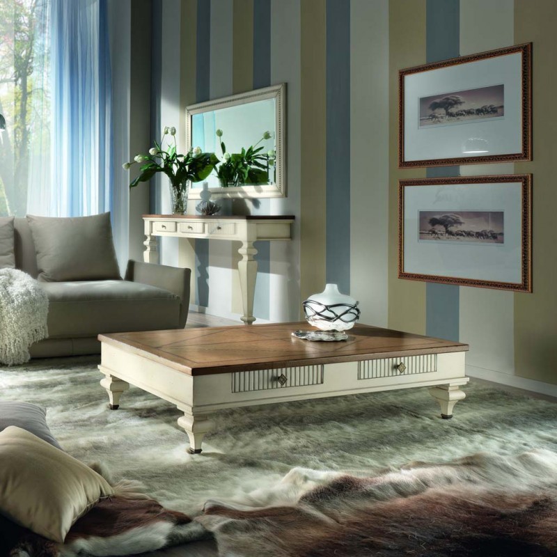 Tavolino rettangolare 2 cassetti con frontale rigato in legno. Funzionale e pratico con gambe sagomate per appoggiare comodamente riviste e oggetti, aggiungendo un tocco di unicità con il piano intarsiato. Ideale per la zona giorno affiancato vicino al divano.
