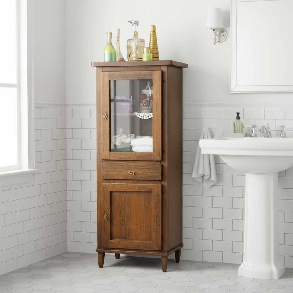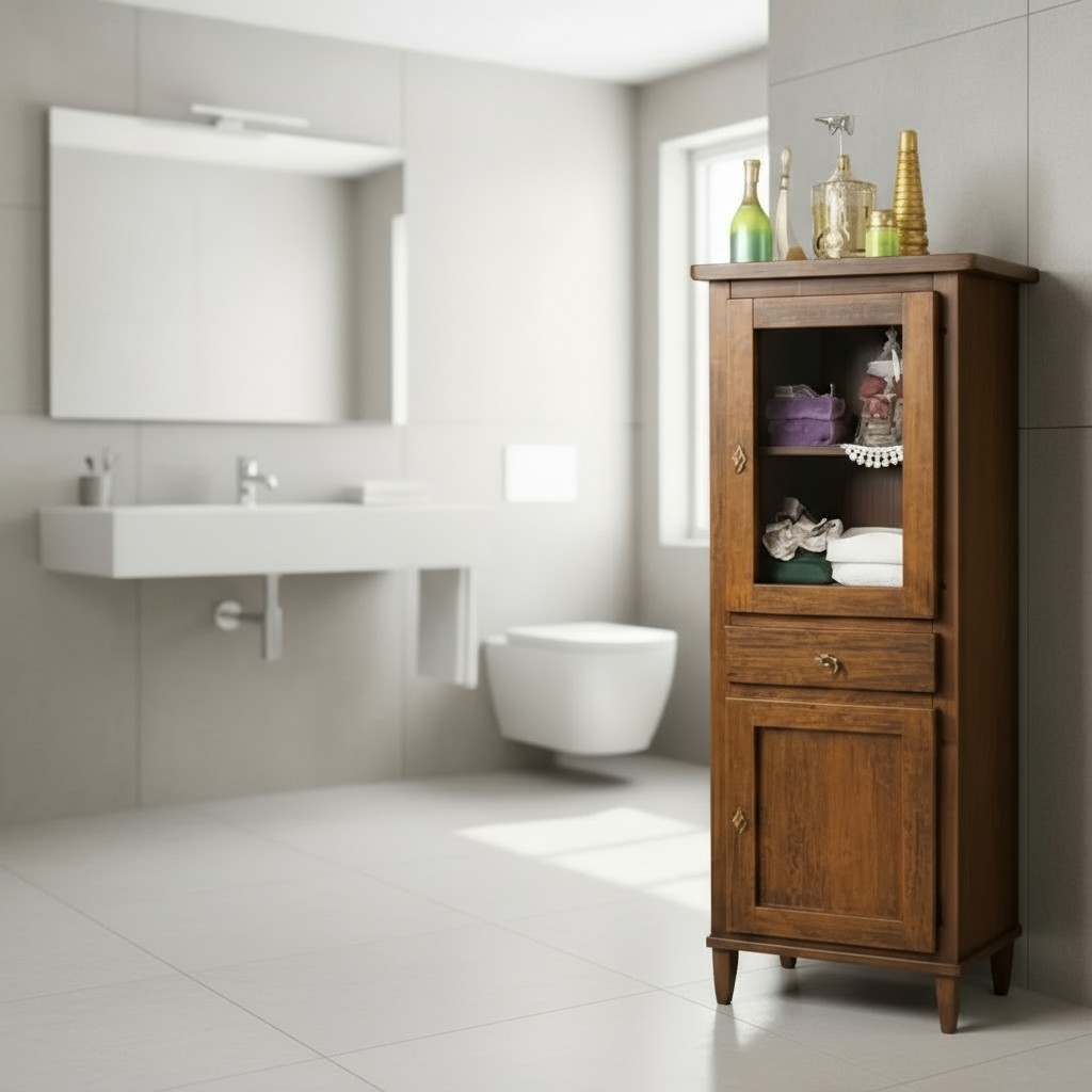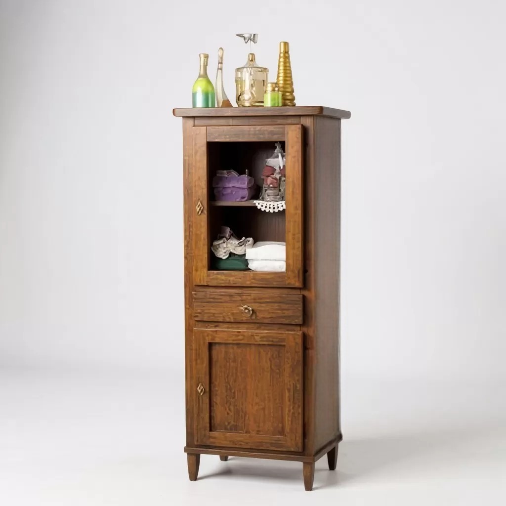 Vetrina colonna costruita in legno rendendo il mobile solido e allo stesso tempo elegante. colonna dallo stile in arte povera e con proporzioni perfette per qualsiasi stanza. Ideale per il soggiorno o come complemento per l'arredo bagno, funzionale e spazioso da inserire in qualsiasi stanza della casa.