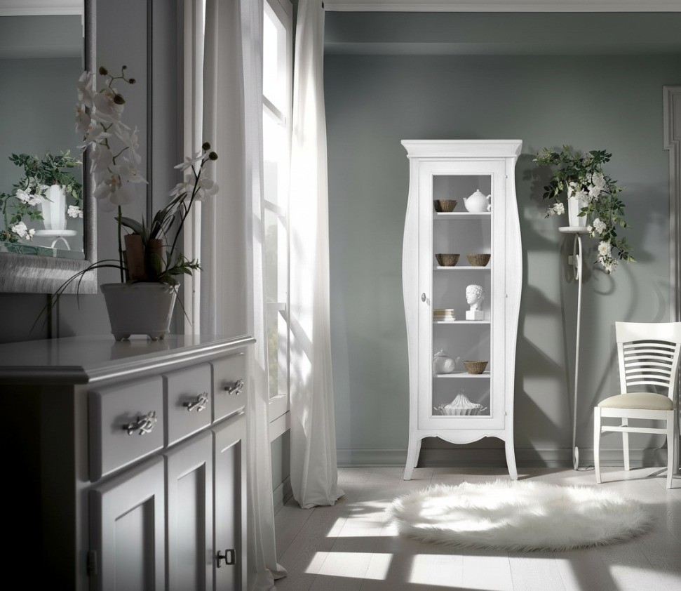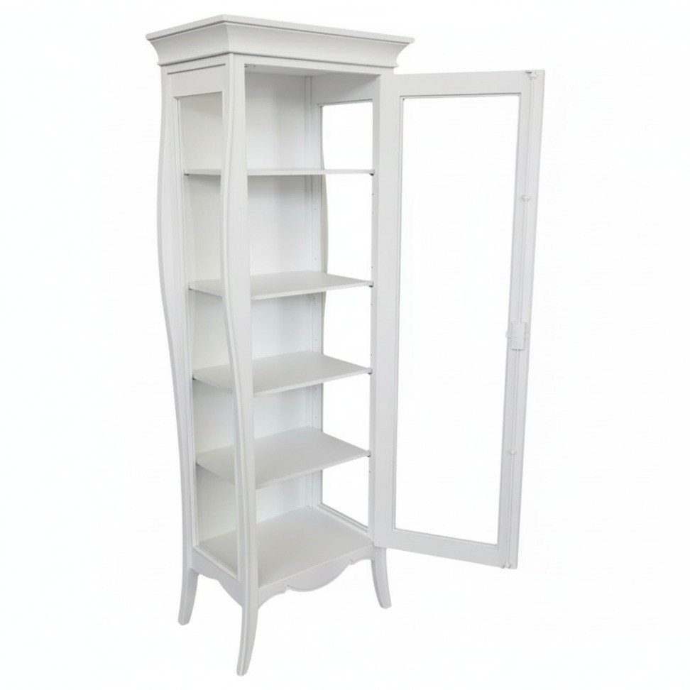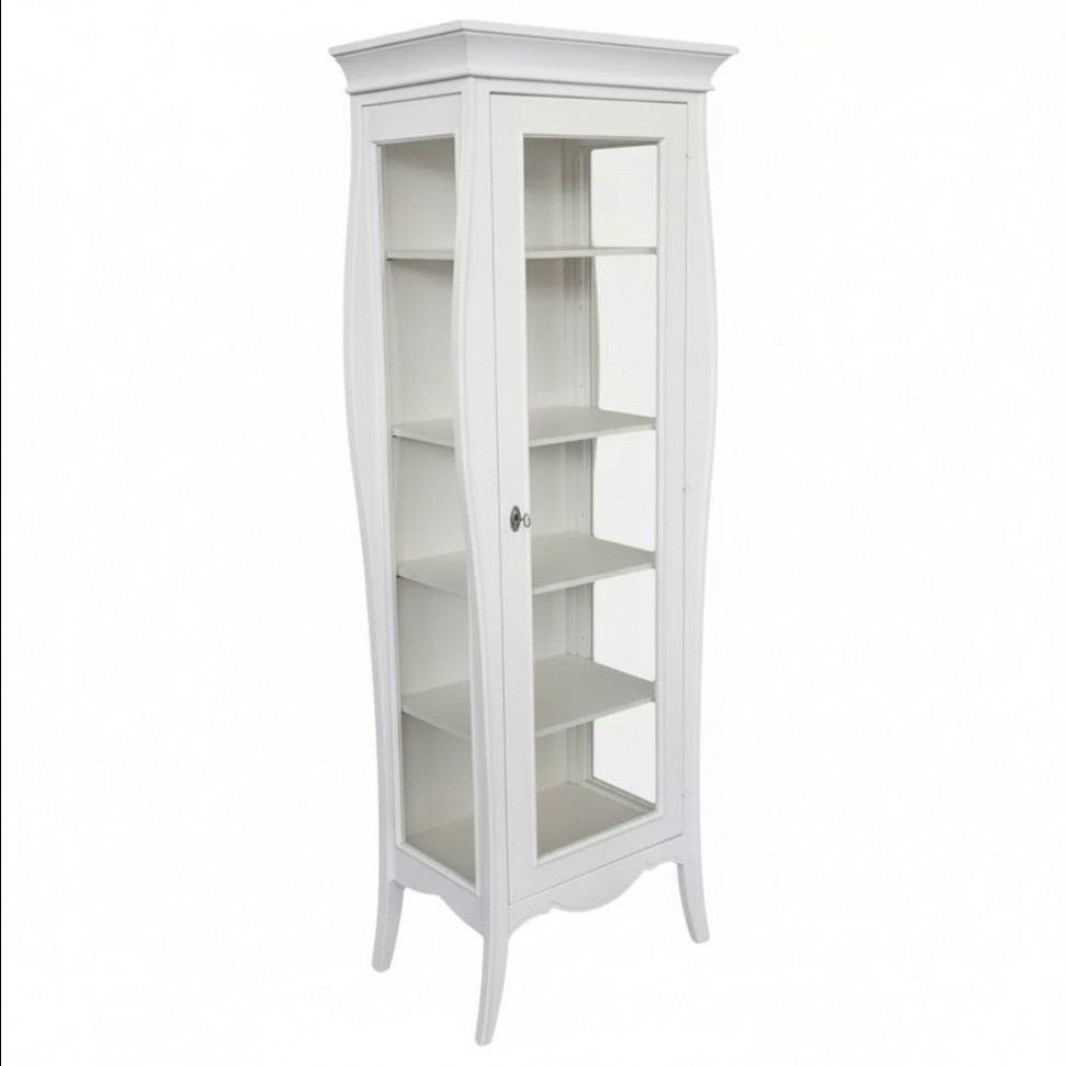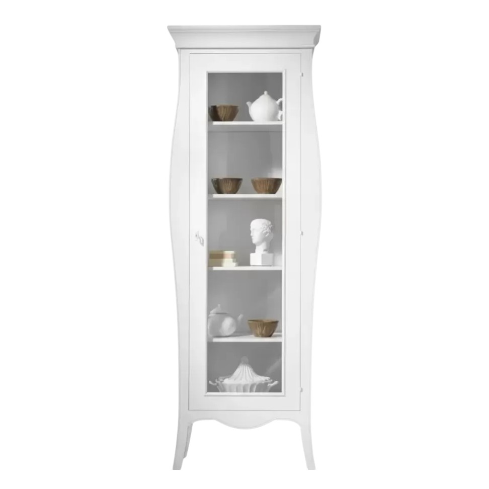 Vetrina in stile classico sagomata in legno bianco . Struttura sagomata con 1 porta battente con vetro ,all' interno grazie ai suoi 4 ripiani si può riporre oggetti in vetro, servizi di piatti e bicchieri da esporre in bella mostra. Ideale per la zona giorno o per l' entrata dell' abitazione.