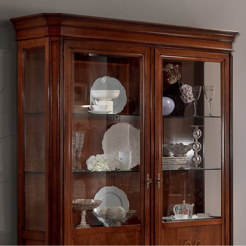 Vetrina classica costruita in legno massello con profili e due porte battenti con vetro e pannelli in legno con rilievi a giglio. Dotata di 2 ripiani in vetro ideali per appoggiare oggetti da collezione, vasi e oggetti in porcellana. Vetrina unica nel suo genere creando un piacevole contrasto con gli oggetti esposti all'interno. Ideale per una zona soggiorno classica o come mobile per l'entrata.