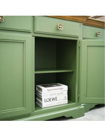 Credenza in legno stile arte shabby, con 4 porte, 4 cassetti e 3 ripiani. Costruita principalmente in legno massello, per assicurare resistenza e durata nel tempo.