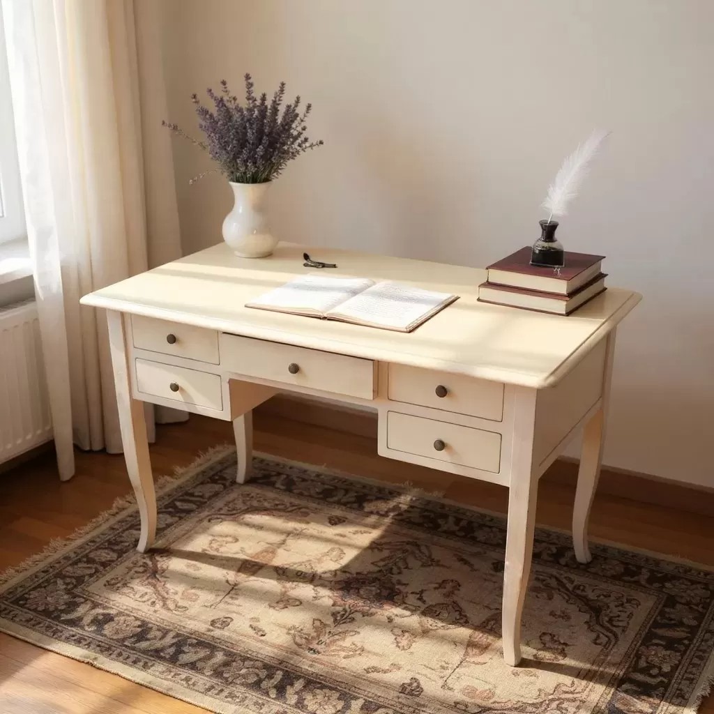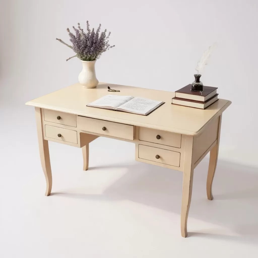 Scrivania arte povera 5 cassetti legno avorio 105x56x81