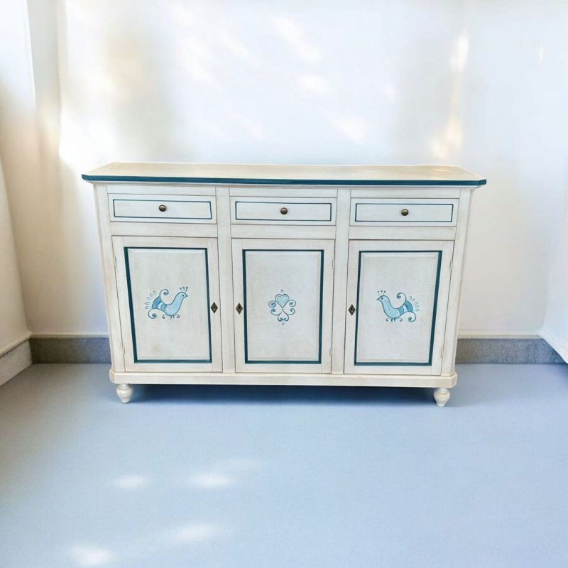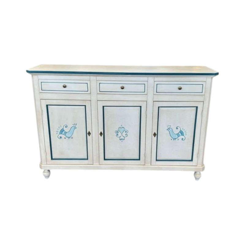 Madia credenza 3 porte legno bianco anticato pavoncella filo blu 150x43x98