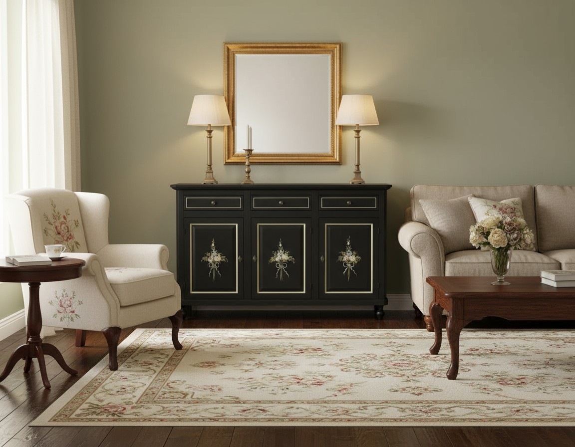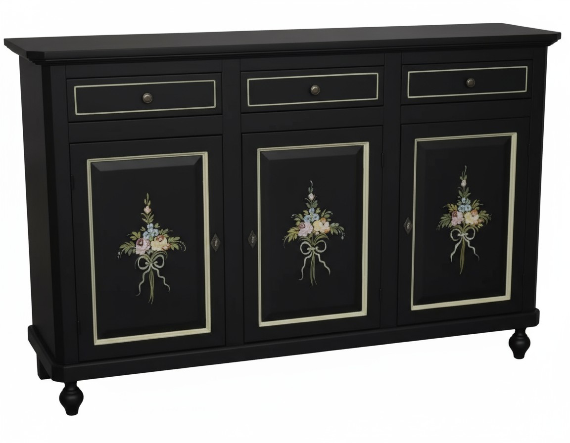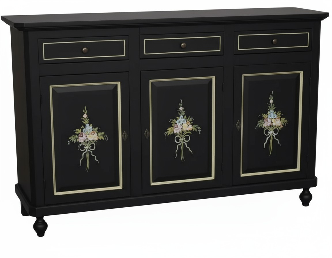 Madia Credenza 3 Ante Legno shabby nero Decorata Filo oro 158x45x98
