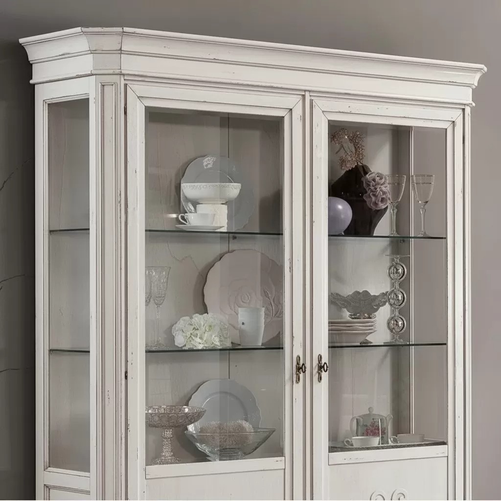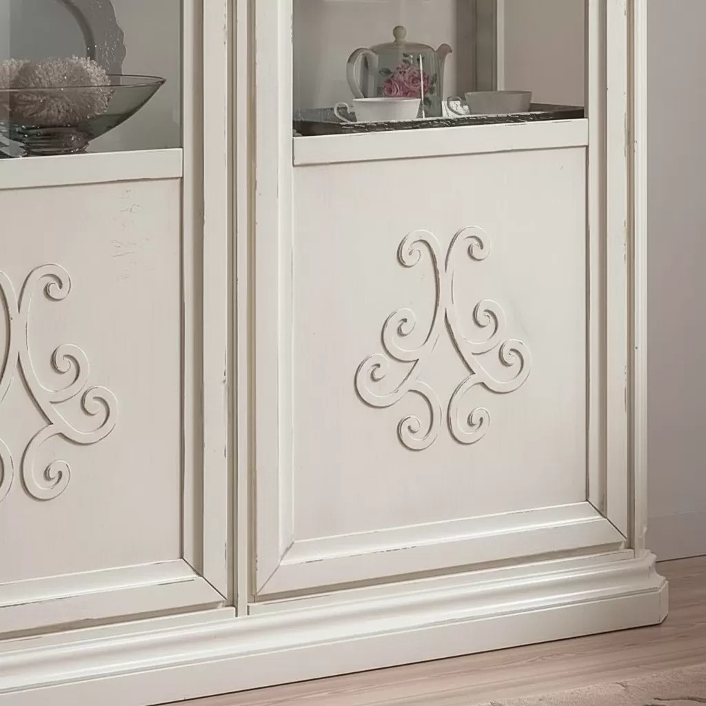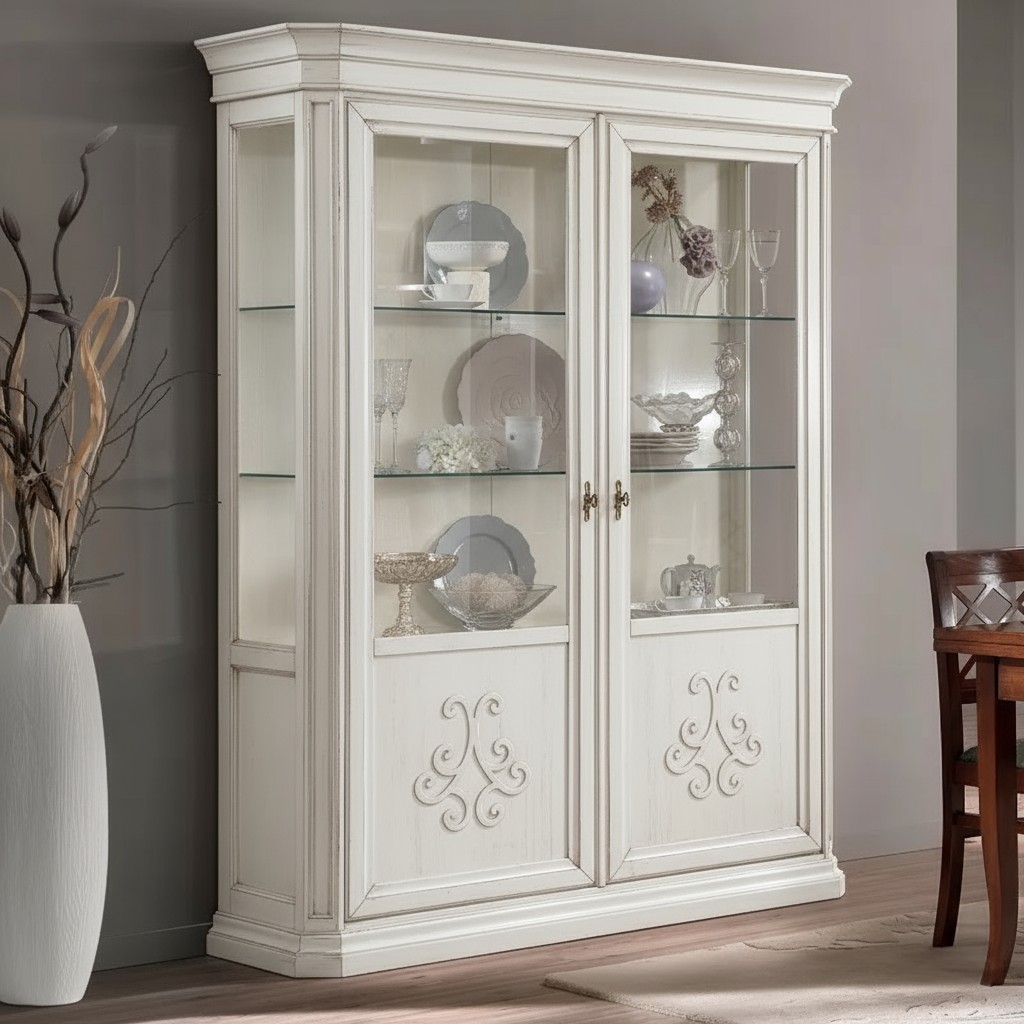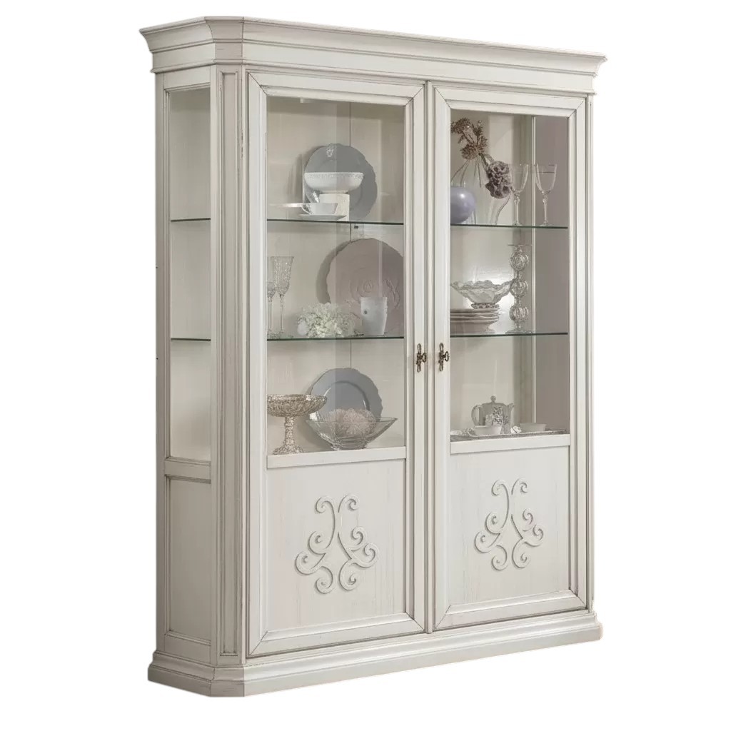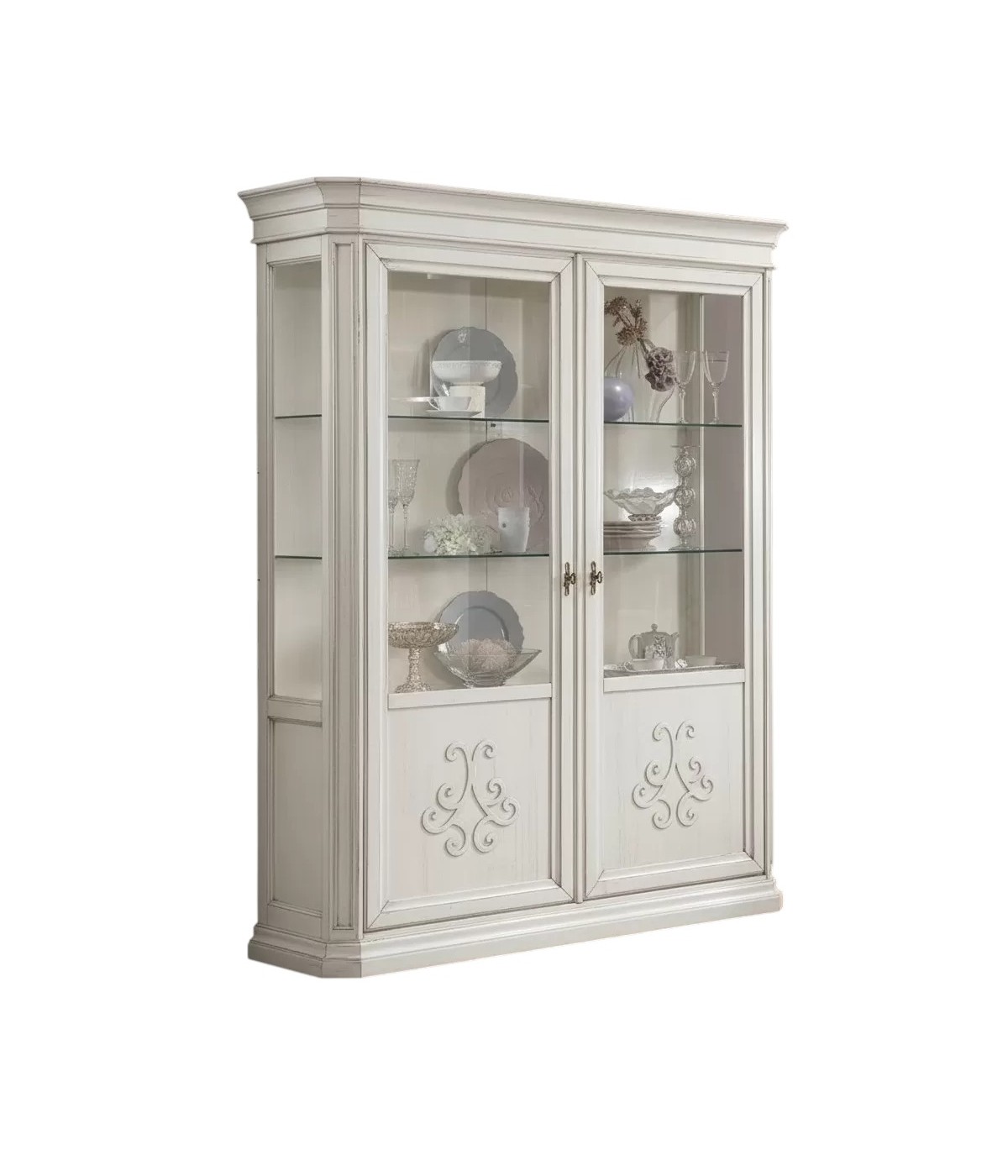 Vetrina classica 2 porte intarsio legno bianco anticato rilievi 162X54x217