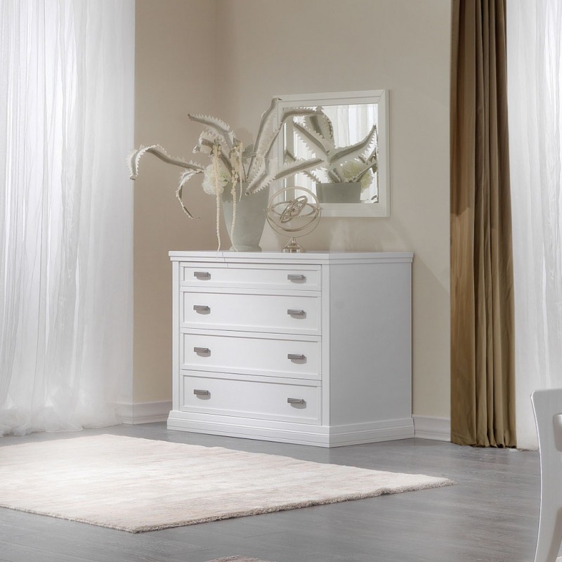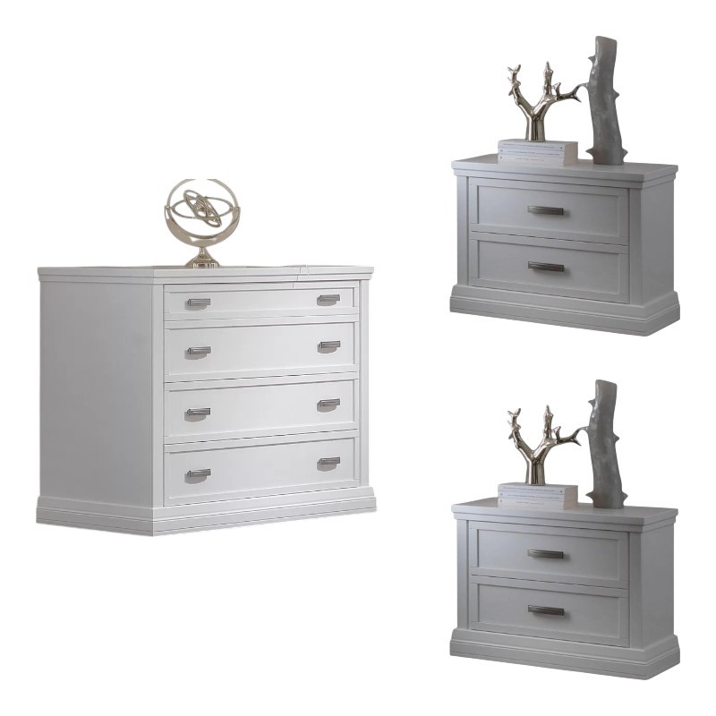 Gruppo cassettiera e due comodini classici costruiti in legno. Cassettiera con quattro cassetti e due comodini dove si possono riporre comodamente indumenti e biancheria intima. Trovano facilmente posto nella zona notte grazie al suo stile intramontabile caratterizzato da un design classico e raffinato. Complemento d'arredo in grado di rendere ancora più accogliente e caldo l'ambiente in cui verranno inseriti. Adatti nelle camere classiche e moderne come elemento di contrasto.