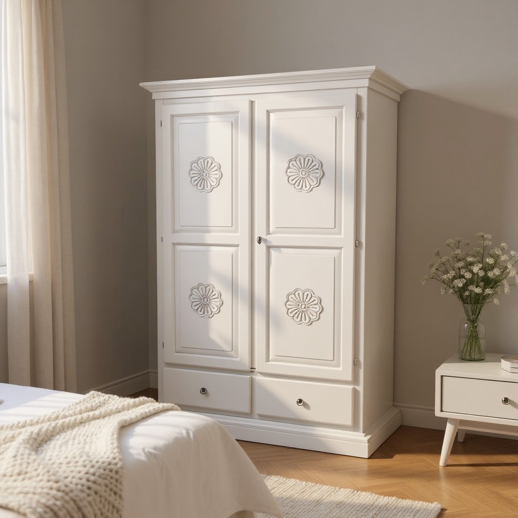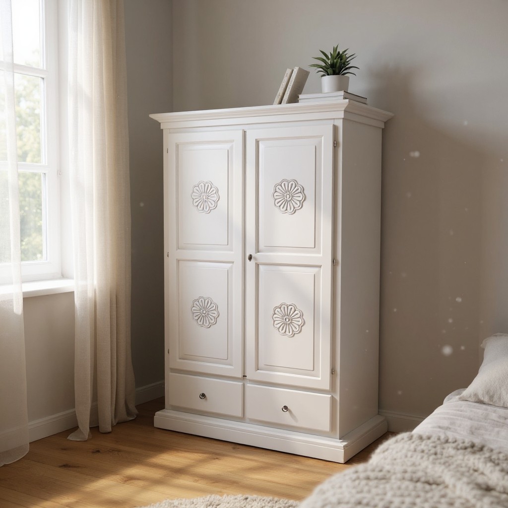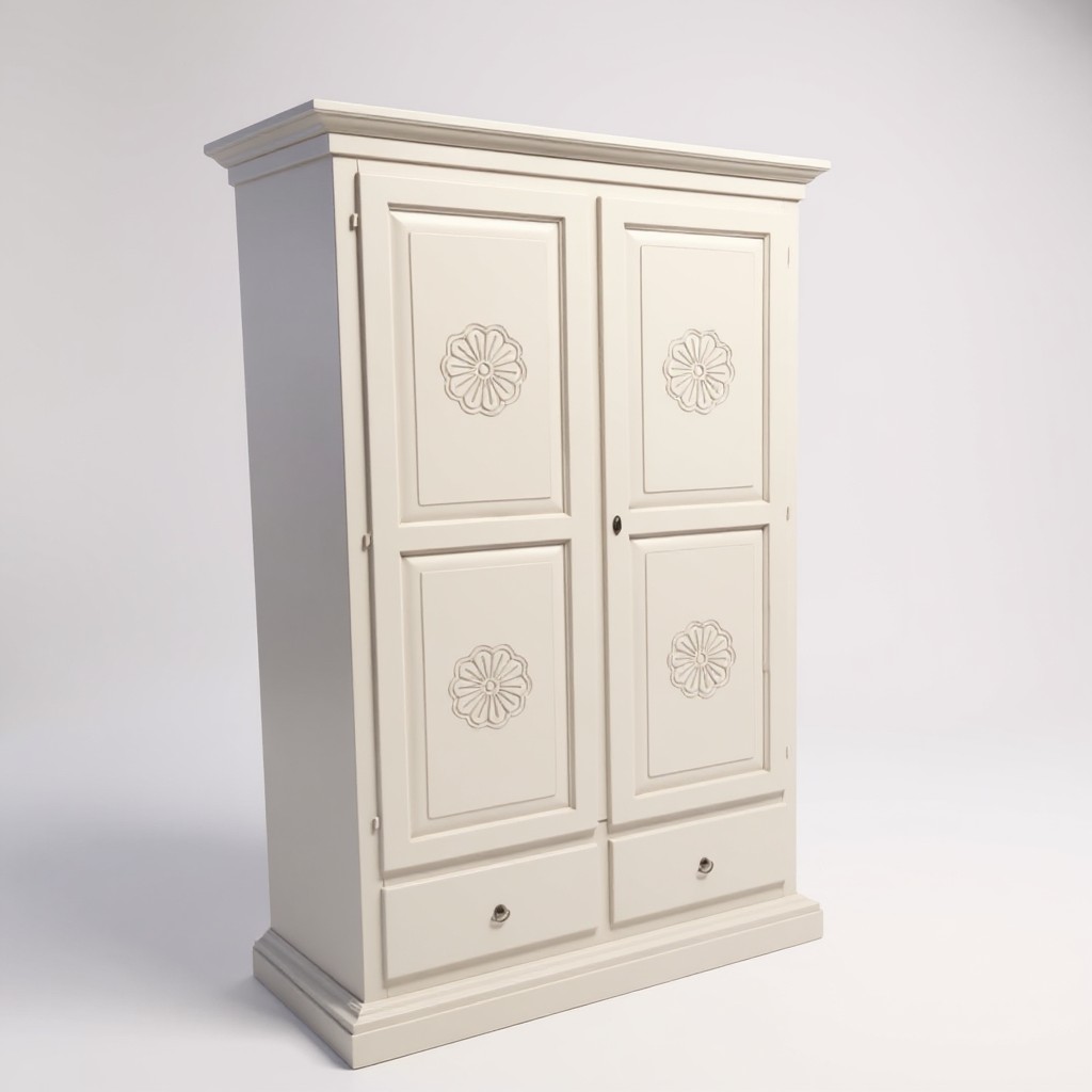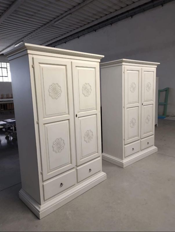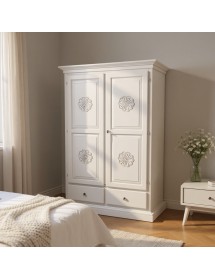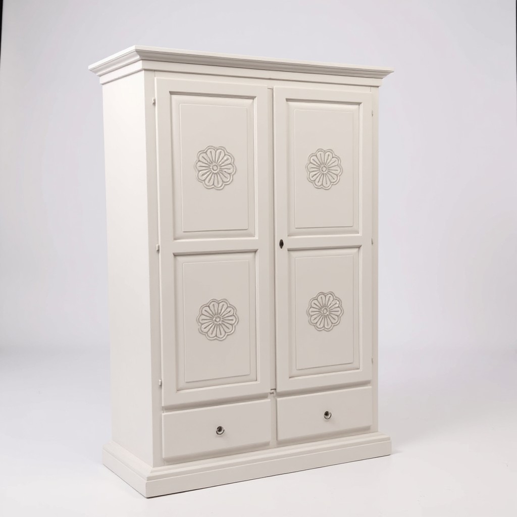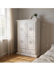 Armadio dallo stile provenzale che saprà impreziosire con le decorazione con gusto la stanza in cui andrà posizionato. Composto da da due porte due cassetti e un palo appendiabiti per il contenimento di biancheria, capi di abbigliamento, sciarpe ,guanti. Pratico e confortevole per creare una combinazione unica donando un tocco di shabby chic alla stanza.