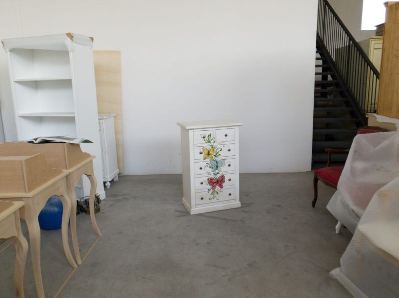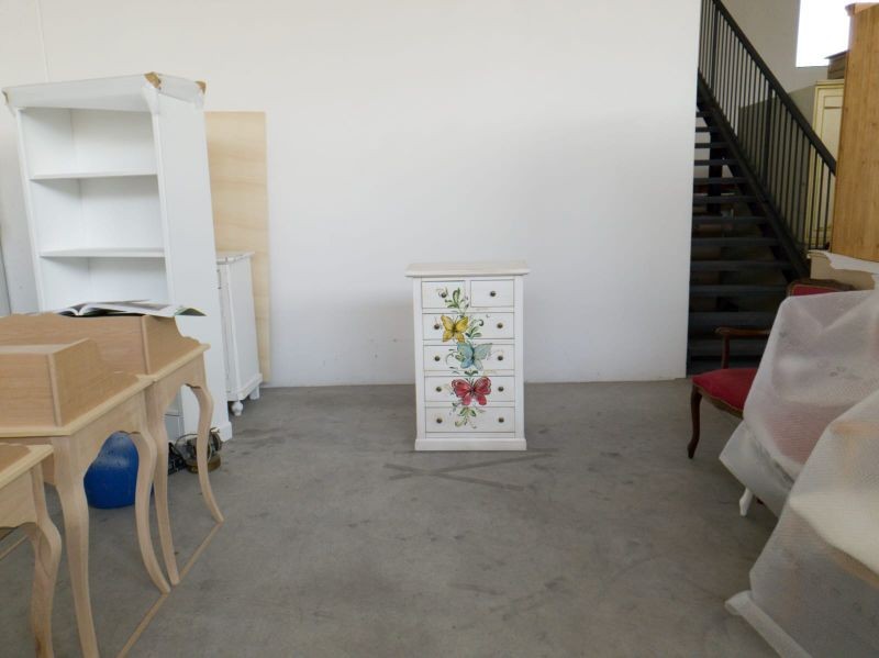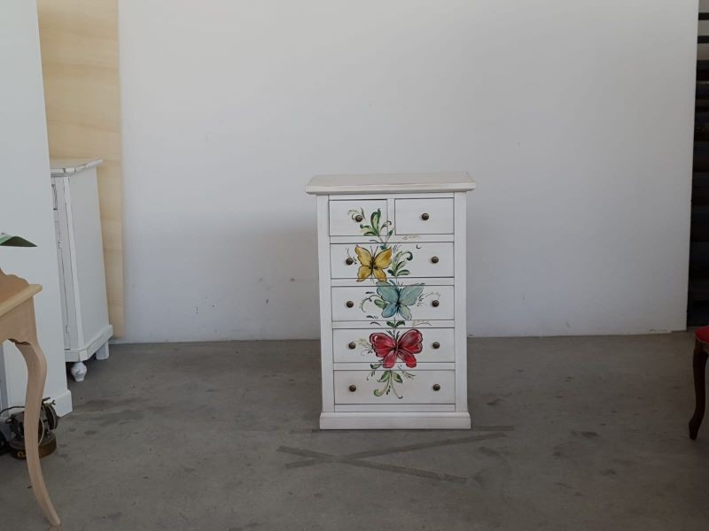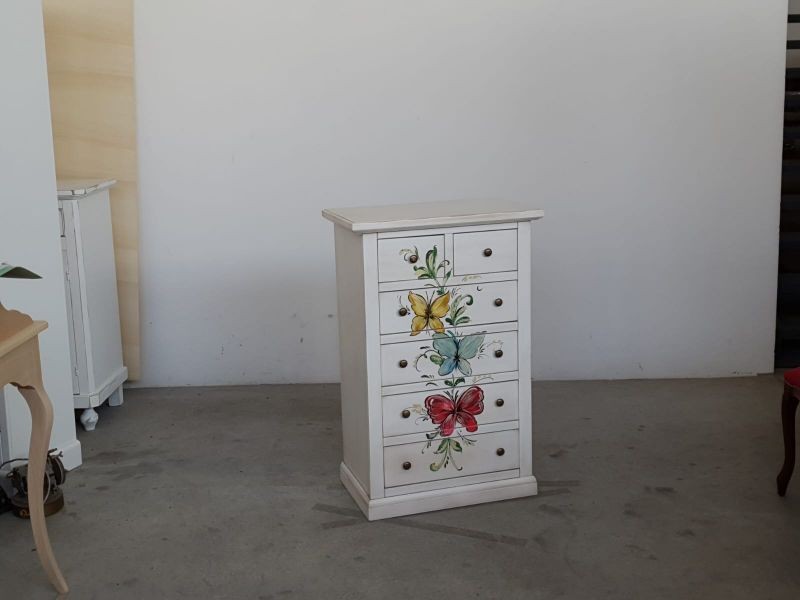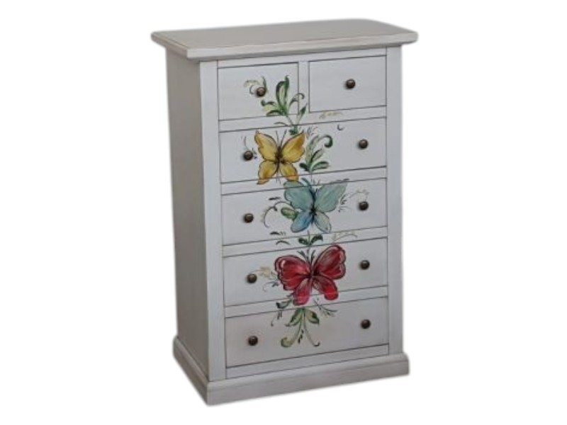 Cassettiera 6 cassetti in legno shabby bianco anticato decori farfalla 62x37X93
